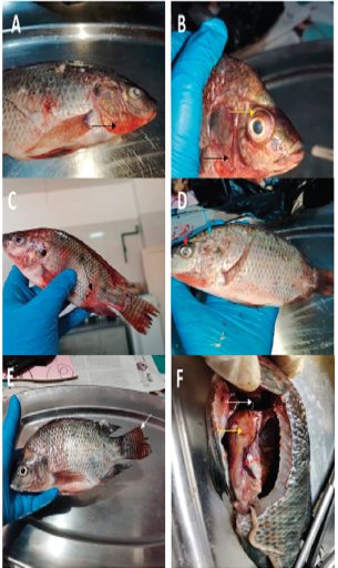 Fig. 1. Naturally infected O. niloticus showed body haemorrhages (Black arrow) and corneal opacity (Red arrow) with unilateral and bilateral exophthalmia (popeyes) (Yellow arrow) in (A–C), scale detachment (Blue arrow) in (D), fin degeneration and erosions (White arrow) in (E), while postmortem examination showed friable enlarged liver with marbling appearance (Yellow arrow), with splenomegaly (Red arrow) and congested gills (White arrow) in (F). Bacterial isolation and identificationThe naturally infected fish included 225 bacterial isolates, which were isolated. These isolates were phenotypically and biochemically characterized by the generally accepted technique published for bacterial isolation and identification. Aeromonas spp., Vibrio spp., Pseudomonas spp., Edwardsiella spp., Enterococcus spp., and Streptococcus spp. were among the isolates that were detected. All isolated bacterial strains have been identified phenotypically and biochemically, as shown in Table 2. Aeromonas hydrophila, sobria, and veronei were identified biochemically as separate species. The colonies of Aeromonas spp. on TSA medium looked glossy, spherical, creamy, and convex after 24 hours of incubation, but colonies on RS medium were light-yellow or deep creamy with the full edge. The isolated Aeromonas species were fermentative, catalase-producing, short rod, oxidase-positive, motile on semisolid medium, and Gram-negative. Table 2. The morphological and biochemical characteristics of isolated bacteria from naturally infected O. niloticus.