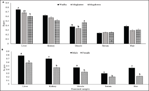 Fig. 4. Selenium mean values (ppm) in liver, kidney, muscle, serum, and hair A. Effect of breed on selenium concentrations (ppm). B. Effect of Gender on selenium concentration (ppm). a,b Means with different superscript letters in the same sample type are significantly different (p ≤ 0.05). ChromiumThe chromium concentration in the current study ranged from 0.032 to 96.62 mg/kg. There are significant differences (p < 0.05) between breeds according to their contents of Cr between liver kidney, muscle, and hair (Fig. 2A). The Cr variations in our findings are attributable to variances in the availability of Cr in forages that are grown in the grazing areas. The highest values of Cr in all examined samples were detected in the liver samples of maghateer magaheem breeds.The correlations between chromium concentrations in organs and serum with breed and gender was displayed in Table (3). The average of Cr in this study was (0.4) mg/kg in meat and organs which coincided with USDA (2006) and China standards (2006) which stated the maximum level of chromium in meat as 1.0 mg/kg. Higher Cr values obtained were 2.333–4.92 mg kg−1 of muscle and 4.256–9.878 mg kg−1 of liver samples in Iran (Asli et al., 2020).