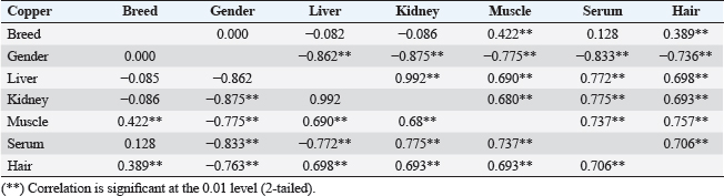 Table 6. Correlations between arsenic concentrations in organs and serum with breed and gender.