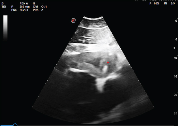 Fig. 2. Ultrasound image of the heart showing irregular border and thickening of the left ventricle wall (*). To characterize the histogenesis and the immunophenotype of the neoplastic cells, immunohistochemistry (IHC) was performed. Tissue sections of neoplastic masses, lymph nodes, and heart were deparaffinized and hydrated, and antigen retrieval was performed in a water bath with a Target Retrieval solution (Dako, Santa Clara, CA). The Novolink™ Max-Polymer detection system (Novocastra, Newcastle, UK) was used for visualization, according to the manufacturer’s instructions. The slides were incubated overnight at 4°C in a humid chamber with polyclonal anti-CD3 antibody (Dako), anti-CD79α (clone HM57, Leica Biosystems), anti-CD20 (clone L26, Dako), anti-Ki67 (clone MIB-1, Dako), anti-PD-L1 (clone ab233482, abcam), and anti-C-KIT (clone CD117, Leica Biosystems). Sections were washed with triphosphate-buffered saline at each step of the procedure. The stain was developed with 3,3-diamino-benzidine (DAB; Sigma, St. Louis, MO) and the sections were counterstained with haematoxylin, dehydrated, and mounted. Positive and negative immunohistochemical controls were included. More than 85% of neoplastic cells showed cytoplasmic immunostaining for CD3 (T cells) (Fig. 4c), and CD20 presented cytoplasmic immunoreactivity in about 5% of cells (B cells) (Fig. 4d). The CD20 marker was selected instead of CD79α due to its superior labelling quality in equine lymphocytes, as previously reported by Durham et al. (2013). Ki-67 proliferative index reached 19% (evaluated by the ratio of positively stained nuclei to at least 1,000 nuclei analysed in the regions of highest expression (hotspots)). No immunostaining for PD-L1 and C-KIT antibodies was detected. According to the anatomical location and distribution of the lesions, along with the histological and immunohistochemical results, the mare was diagnosed with a medium-grade multicentric T-cell lymphoma. Paraffin-embedded lung and neoplastic tissue samples cut at 10 μm were processed for DNA extraction using the EXTRACTME® DNA tissue kit (Blirt, Trzy Lipy, Poland) according to the manufacturer’s instructions. A seminested polymerase chain reaction (PCR) targeting a 230 bp region of the glycoprotein B of Equid Herpesvirus 5 (EHV-5) was performed as previously described (Marenzoni et al. 2010). Briefly, a total of 2 μl of genomic DNA was added to 12.5 μl of Xpert Fast Hotstart Mastermix (2X) with dye (GRISP, Porto, Portugal), 8.5 μl of deionized sterile water, and 1 μl (10 μM) of primers in a 25.0 μl final volume of the reaction mixture. The reactions were carried out in an automatic DNA thermal cycler 100 (Bio-Rad), including negative (water) and positive controls. The PCR amplification products were visualized by Xpert green (Grisp, Porto, Portugal) fluorescence after electrophoresis in a 1.5% agarose gel at 100 V for 40 minutes. After the seminested PCR and electrophoresis, no amplified product of the expected size was visualized.