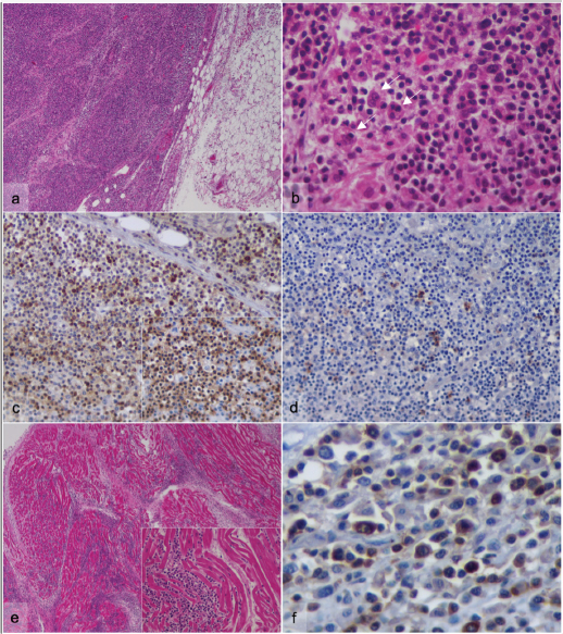 Fig. 4. Microscopic evaluation of the multinodular masses and heart. (a)–(d) Abdominal neoplastic formations; (a) Partially encapsulated neoplastic lesion composed of dense population of round cells (H&E, 100x); (b) Note the high pleomorphism of the neoplastic cells and the presence of numerous multinucleated cells (arrows) (H&E, 600x); (c) The majority of neoplastic cells express diffuse cytoplasmatic immunostaining for CD3 (DAB, 100x); Inset: cytoplasmatic and membranous CD3 positive staining (DAB, 400x); (d) Scattered lymphocytes expressing cytoplasmatic CD20 immunostaining (DAB, 100x). (e) and (f) Heart; (e) Diffuse infiltration of endocardium by neoplastic lymphocytes (H&E, 40x, 600x); (f) Lymphocytic infiltration of CD3 immunopositive cells (DAB, 600x). Clinical signs in horses with lymphoma are often nonspecific, and depend on the organs affected (Ness, 2016). The first evident clinical signs presented by this mare were facial oedema, enlarged mandibular head lymph nodes, and recurrent fever, so different causes were considered. Lymphadenopathy is a common finding in horses with multicentric lymphoma (Ness, 2016). Enlargement of the lymph nodes of the head, namely the mandibular lymph nodes, is occasionally the result of sinusitis, guttural pouch disorders, or a response to generalized respiratory infections such as equine influenza, EHV-1 and EHV-4 or Streptococcus equi subsp. equi (McGorum and Dixon, 2000). In this case, nasal discharge was not present, and the imaging studies did not reveal the presence of foreign bodies or other relevant abnormalities in the upper respiratory tract. After fever therapeutic ineffectiveness, other causes were investigated. Tumour necrosis, as well as the release of cytokines produced by the tumour or by reactive macrophages, can cause an increase in body temperature and justify the refractory response to antibiotics (Ness, 2016). In advanced stages of the disease, clinical signs reflect organ failure due to invasion by neoplastic lymphocytes, with consequent tissue destruction and loss of function (Ness, 2016). Haematological and biochemical alterations are variable. In this case, neutrophilia was evident, probably in response to tumour necrosis and lymphocytosis (Meyer et al., 2006). Thrombocytopenia occurs less frequently, but its detection in late-stage disease may indicate immune-mediated destruction or infiltration of the bone marrow (Ness, 2016). In this animal, the most evident biochemical alterations during the course of the disease were hyperglobulinemia and hypoalbuminemia, concordant findings in animals with lymphoma. Hyperglobulinemia may reflect a systemic inflammatory response to tumour necrosis (Ness, 2016), a paraneoplastic process or atypical antibodies generated by neoplastic lymphocytes (Wensley et al., 2023). It may also result in down-regulation of albumin synthesis, which may also be diminished by inadequate intake and absorption of nutrients (Wensley et al., 2023). The proteinogram revealed a monoclonal gammopathy due to the overproduction of immunoglobulins, suggestive of lymphoid neoplasia. A recent study on equine lymphoma performed by Wensley et al. (2023) associated high concentrations of globulin with decreased survival time, suggesting that hyperglobulinemia acts as a negative prognostic factor in this disease. Hyperfibrinogenaemia is a common laboratory finding in horses with lymphoma (Meyer et al., 2006) however, this parameter was not evaluated in this animal. Histopathologically, lymphomas are generally heterogeneous, and the morphology of neoplastic lymphocytes is variable, making it often difficult to distinguish between reactive cells and well-differentiated neoplastic cells (Rendle et al., 2012). In this case, infiltration of macrophages and multinucleated cells was observed, consistent with previous reports (Ueno et al., 2012). Multinucleated giant cells are a common finding in equine lymphoma biopsies and were previously associated with T cell-derived lymphomas (Ueno et al., 2012). It was hypothesized that neoplastic T lymphocytes produce interferon gamma that may result in macrophage activation and the formation of multinucleated cells (Ueno et al., 2012). The mitotic count predicts the grade of lymphoma, which can be indolent, low-, medium-, or high-grade (Durham et al., 2013). In this case, the lymphoma was classified as medium grade (6 to 10 mitoses/HPF). IHC enables the determination of the immunophenotype of neoplastic lymphocytes. In this case, although few positive B cells were observed within the neoplastic population, the great majority of the neoplastic lymphocytic population was CD3 positive, assigning its origin to T cells and allowing the diagnosis of T-cell lymphoma. In a retrospective study carried out by Durham et al. (2013) in 203 horses with lymphoma classified according to the World Health Organization (WHO) classification system, TCRBCL was the most common phenotype in horses (43%), followed by peripheral T-cell lymphoma (22%), and the multicentric form is usually related to these two phenotypes (Durham et al., 2013). Although not yet fully clarified in horses, T-cell lymphoma is generally more aggressive and has a poorer prognosis when compared to B-cell lymphoma (Taintor and Schleis, 2011). Furthermore, the multicentric and mediastinal forms were also associated with decreased survival time compared to other locations (Wensley et al., 2023). Regardless of lymphoma subtype, the prognosis is poor, and the survival time is variable and depends on the extension of the disease and organs involved (Ness, 2016). Due to multi-organ failure, most horses with multicentric lymphoma are euthanized a few weeks to months after diagnosis (Meyer et al., 2006). In the present case, the mare ended up dying due to the worsening of the clinical picture, 24 days after the detection of the first clinical signs. The diagnosis of lymphoma is essentially established at an advanced stage of the disease, res
