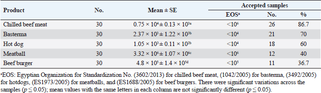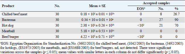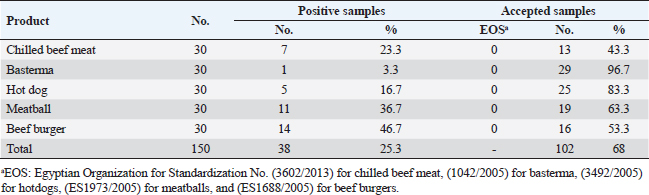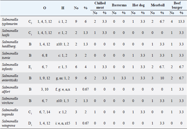 Table 3 shows the ENT (CFU/g) in the inspected products were 0.18 × 102 ± 0.01 × 102, 0.34 × 10 ± 0.01 × 10, 2.38 × 102 ± 0.26 × 102, 5.18 × 102 ± 0.53 × 102, and 4.22 × 103 ± 0.71 × 103 for chilled beef meat, basterma, hot dog, meatball, and beef burger samples, respectively. Table 4 proves the prevalence of Salmonella spp. (CFU/g). The studied products were 23.3%, 3.3%, 16.7%, 16.7%, 46.7%, and 25.3% of chilled beef meat, basterma, hot dog, meatball, and beef burger samples, respectively. 43.3%, 96.7%, 83.3%, 63.3%, 53.3%, and 68% of samples accepted according to EOS (2005a–d). Table 5 demonstrates the serological identification of Salmonella spp. in the inspected products in which the most detected species were Salmonella typhimurium (6%), S. Haifa (1.3%), Salmonella heidelberg (1.3%), Salmonella tsevie (2%), Salmonella infantis (4%), Salmonella enteritidis (6%), Salmonella alfort (0.67%), Salmonella virchow (1.3%), Salmonella inganda (2%), and Salmonella wingrove (0.67%). Table 3. ENT (CFU/g) and their acceptability in the examined products.
