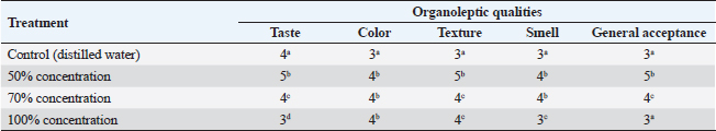 Different superscript letters indicate that values within the same column are significantly different. T1: immersing the steak meat in distilled water, T2: the steak meat only got a microorganism inoculation, T3: immersing the inoculated steak meat in apple vinegar at a concentration of 50%, T4: immersing the inoculated steak meat in apple vinegar at a concentration of 70%, T5: immersing the inoculated steak meat in apple vinegar at a concentration of 100%. Table 7. Effect of natural apple vinegar marination on organoleptic properties of the beef steak.