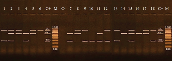 Fig. 1. Agarose gel electrophoresis of multiplex PCR of virulence genes to characterize Salmonella spp. M: 100 bp ladder as molecular size DNA marker. C+: control positive for invA, stn, and hilA genes. C-: Control negative. Lane 1, 2, 3, 5, 6, 8, 9, 12, 13, 15, 17, and 18: positive for hilA (854 bp). Lane 2, 3, 4, 5, 7, 8, 11, 14, 15, 16, and 17: positive for stn (617 bp). Lane 1, 2, 4, 7, 9, 10, 11, 12, 13, 15, and 18: positive for invA (275 bp). Overall, 38 (25.3%) samples tested positive for Salmonella (Table 4). Meatballs (46.7) and beef burgers (25.3%) had the highest rate of contamination; meanwhile, 68% of samples were accepted, according to EOS 2005a–d. These results concurred with those that were documented by Elsisy and Salwa (2019) but differed from those of Younes et al. (2019), Abdel-Atty et al. (2023), and Elbayoumi et al. (2023). Meat cutting and contamination, elevated water and oxygen concentrations, worker hand contamination, and grinder contamination are all potential sources of Salmonella contamination in meat products (Younes et al., 2019). Salmonella infection is among the most prevalent enteric bacterial sicknesses affecting humans. Its significance to public health is primarily related to foodborne infection, typically caused by consuming meat frequently colonized by zoonotic serovars (Melo et al., 2021). Based on serotyping analyses (Table 5), 38 Salmonella isolates, with one isolate from each serotype. The major isolated serovars were S. typhimurium (6%), S. enteritidis (6%), and S. infantis (4%). The finding of the present investigations matched with the findings of Yang et al. (2019), Abd El-Tawab et al. (2020), and Melo et al. (2021). The most frequently reported serovars linked to human salmonellosis cases globally are S. enterica subsp. enterica serovars enteritidis and typhimurium. According to Yang et al. (2019), different serovars have varied disease potentials, making the determination of serotypes crucial for epidemiological surveillance and disease assessment. Therefore, the high incidence of these serovars in the current study indicates that consumers face a substantial risk. The distribution of the serovars across the various food sources suggests that Salmonella strains exhibit a high level of genetic variation. Other serovars detected regularly in the current investigation included S. enteritidis, S. tsevie, S. inganda, and S. wingrove, which have all been linked to meat contamination in other studies (Samaha et al., 2016; Saad et al., 2018; Abd El-Tawab et al., 2020). This shows that these serovars are becoming increasingly common pollutants of food staff and should be regarded as a public health risk. Unfortunately, according to Yang et al. (2019), most of the Salmonella serovars found in the current investigation are often known to cause human salmonellosis. DNA molecular discovery technique has recently been widely used in Salmonella detection, offering quick, sensitive, and specific detection. Salmonella’s unique virulence characteristics significantly determine its pathogenicity and contribute to the substantial morbidity and mortality associated with salmonellosis in humans (Lu et al., 2022). The finding of the discovery of Salmonella invasive encoding genes achieved by PCR displayed in Figure 1 that there were 12 samples from 18 samples of Salmonella isolates which detected a hilA gene with a length of 854 bp, 11 samples detected a stn gene with a length of 617 bp, and 11 samples identified an invA gene with a length of 275 bp. This outcome has a similarity to that recorded by Abd El-Malek (2015), Abd El-Tawab et al. (2020), and Lu et al. (2022). Identifying many Salmonella virulence genes in this study allowed for some possible risk projections that will aid in public health controlling. According to the findings of a recent study (Mthembu et al., 2019; Sharma et al., 2019), the delivery of Salmonella serovars in beef foods is not substantially associated with the sample kind (p ≤ 0.05). The study of virulence genes can provide useful information for investigating Salmonella pathogenicity. The mechanism of virulence genes has to be investigated further because of the widespread occurrence of virulence genes in pathogenic bacteria and the potential for transfer. Such research will help us comprehend Salmonella’s pathogenic mechanism while also preventing and controlling salmonellosis epidemics. Many studies were directed to discover a new way to increase the preservation period of meat and its products and stay away from chemical additives, as attention has turned in recent years toward the use of numerous natural alternatives to extend the life of meat preservation and its products and increase the storage life, especially with a significant increase in the manufacture of meat products as well as their role in giving the desired flavor and taste, they can lengthen the shelf life of the food product because of its various therapeutic properties that cause its chemical content of active groups such as phenolic compounds and organic acids (Al-Hadidy et al., 2023). Apple cider vinegar is a fermented product classified as a functional food because of its compounds and nutrients, such as minerals and vitamins in addition to having inhibitory effectiveness toward many microorganisms through its role in inhibiting the transport of nutrients through its cell membrane as well as its role in improving its manufacturing properties (Alagoz et al., 2020), marinating can be described as the processing of raw meat with numerous components comprising vinegar or organic acids, oil, salt, sugar, herbs, spices and flavoring constituents for tenderizing meat, improving its juiciness and flavor, as well as improving microbiological properties and safeguarding the meat safety (Lopes et al., 2022). The effect of apple vinegar on Salmonella count and holding time in inoculated beef steaks in vitro (Table 6) by immersing the inoculated steak meat in apple