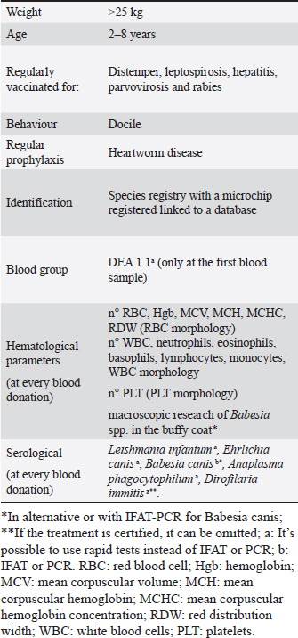 ABSTRACTBackground: In recent years, the field of transfusion medicine for dogs has advanced significantly, becoming a crucial aspect of veterinary clinical practice. Nowadays, blood still remains a fundamental biological source and the welfare and health status of eligible species-specific blood donors are essential for veterinary transfusion medicine. Aim: This study focused on evaluating two shelters in Central Italy (Marche region), located in Tolentino (TS) and in Camerino (CS), in order to assess the potential of the shelter dogs as canine blood donors. Methods: We evaluated a total of 45 dogs from these shelters based on physical (age and size), clinical, behavioural, and blood analysis criteria described in the Italian Ministerial Guideline for Veterinary Transfusion Medicine (2016). Results: At the TS shelter, out of 206 resident dogs, 125 met the donation criteria (60.68%), with 28 (13.59%) selected for the study due to the impossibility to collect the samplings or other exclusion causes. In the CS shelter, of the 149 dogs, 17 (11.41%) were identified as potential blood donors and included in the study. Among these, seven dogs (25%) from TS and five dogs (29.41%) from CS were found to have DEA1 negative blood group. High percentages (TS=25.24%, CS=40.27%) of dogs were excluded for seniority and 29.53% in CS for behavioural issues. Notable findings included reduced erythrocyte mean corpuscular volume [mean TS=63.93 fl; CS=64.00 fl] and Reticulocyte Hemoglobin [mean TS=22.39 pg; CS=21.38 pg]. Additionally, in both shelters’ dogs showed a modest increase in eosinophils levels [mean TS=1.59 K/μl; CS=1.02 K/μl]. Conclusion: Shelter dogs can fulfill the blood donation requirements set by the Italian Ministerial Guideline on Veterinary Transfusion Medicine. They are generally in good health and present a low risk of transmitting parasitic diseases; however, many are ineligible for donation due to behavioural pathologies or temperament issues and seniority. Keywords: Dog, Transfusion medicine, Guideline, Blood donor, Shelter. IntroductionTransfusion medicine in veterinary medicine is an expanding field, offering new opportunities for development, research, and applications. Its global adoption in recent years has led various countries to establish diverse regulatory frameworks. For instance, the American College of Veterinary Internal Medicine (ACVIM) in the United States issued the consensus statement in 2005 (Wardrop et al., 2005), then updated in 2016 (Wardrop et al., 2016), addressing the testing for infectious diseases in canine and feline blood donors. These laboratory tests, including blood type identification, crossmatching tests, and pathogen screening are essential to increase the safety of blood donation. They help monitor the donor’s health, reduce post-transfusion adverse reactions in recipients, and minimize the risk of vector-borne diseases (Reine, 2004; Wardrop et al, 2023). In Italy, the 2016 Ministerial Guideline on Veterinary Transfusion Medicine sets out detailed criteria for selecting donor animals (dogs, cats, and horses). It covers eligibility, exclusion standards, required blood tests, and procedures for collecting and storing blood. For example, donor dogs should weigh over 25 kg, be aged between 2 and 8 years, be docile, clinically healthy, regularly vaccinated, and undergo regular prophylaxis against heartworm, ectoparasite, and endoparasite. Blood donor animals must be healthy and constantly monitored. This approach, not only supports preventive medicine, but also allows for ongoing health monitoring of the animals and tracking of epidemiological infectious disease trends (Morganti et al., 2022). This is particularly pertinent in shelter environments, where managing individual health and controlling infectious diseases can be more challenging, from the perspective of preventive medicine (Mutinelli et al., 2013). Given this context, our study aimed to explore the feasibility of using shelter dogs in central Italy as blood donors. Historically, this has never been pursued due to unknown clinical and transfusion histories of shelter dogs and potential ethical concerns (Yagi and Bean, 2016). Currently, specific blood donation programs for dog shelters are absent, yet they could be viable candidates for transfusion medicine practices, provided their physical well-being is maintained and ethical considerations are respected (DeLuca et al, 2006; Mutinelli et al., 2013). Additionally, canine blood donation could foster awareness of transfusion practices and encourage blood donation among dog owners and, by extension, in humans (Ashall et al, 2017; Wilder and Humm, 2019). In 2012, the Marche region implemented a surveillance plan for Leishmaniasis control, as it is an endemic area for this protozoan infection (Surveillance Plan, 2012). Blood samples for this study were collected as part of this regional plan (“Regional law”), with authorization from the respective shelter managers. Marche Region is a territory of Central Italy fronting on the Adriatic Sea and comprises five provinces; in the eastern part is bathed by the Adriatic Sea, the Umbrian-Marchigian section of the Apennines serves as its mountain backbone and it is mainly characterized by hills [Website Britannica.com]. This preliminary study is the first of its kind in the region, aiming to assess the suitability of shelter dogs as blood donors, considering their health status and the potential to contribute to transfusion medicine. Materials and MethodsBlood samples were collected during the 2020–2021 years from two shelters in Central Italy-Marche Region: “Monti Azzurri” in Tolentino and “Colle Altino” in Camerino, located in the mountain area of the region. A manager and an official veterinarian are present in both shelters. In these shelters, dogs are divided by fences, single or with more individuals, with indoor kennels and material for heating, bowls and a stool in front. At least 
