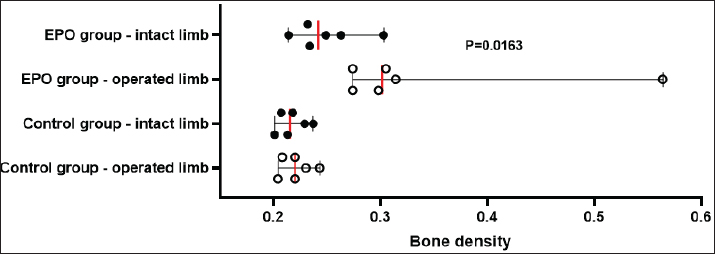Fig. 1. Bone mineral density (g/cm2) of the femur in control and EPO-treated cats. The red line corresponds to the median value. The pain from limb loading, pain after palpation at the fracture site, and weight bearing on the operated limb are among the most frequently used clinical criteria for the evaluation of bone healing (Corrales et al., 2008). The last parameter was found to increase with time after the surgery and correlated with fractured bone strength (Joslin et al., 2008). The cats from the EPO group began bearing weight on the operated limb as early as the first post-operative day, whereas control cats—on the third day. This finding indicates stable fixation of bone fragments from one hand and dull pain sensation from the other. EPO pain control (Derakhshan, 2018) is mediated through its regulatory effect on inflammation, as it inhibits the expression of pro-inflammatory factors by reducing of activity of macrophageal nuclear factor kappa B (Nairz et al., 2011). Complete blood count tests are used for monitoring the clinical status of the patients and occurred post-traumatic changes for the prevention of possible complications. On the 7th day after the osteosynthesis, Kumar et al. (2016) reported an insignificant decrease in RBC counts and Hb content, followed by variations within the reference range for the species, a finding supported by our results in control animals (Kumar et al., 2016). Comparable results were also reported by Tembhurne et al. (2010) and Rajhans (2013) in dogs (Tembhurne et al., 2010; Rajhans, 2013), Kumar et al. (1999) in calves (Kumar et al., 1999), and Gabriel et al. (2014) and Gupta (2015) in goats (Gabriel et al., 2014; Gupta, 2015). The transient reduction of RBC counts in the above-mentioned studies may be attributed to fracture trauma and preoperative and intraoperative blood loss. In the EPO group, the opposite tendency was observed: RBCs, Hb, and Hct increased gradually than the initial levels, with a statistically significant difference versus baseline on the 8th post-operative week. This is attributed to the hematopoietic effect of EPO, which was also observed in experimental studies in rats (Diker et al., 2018). In humans subjected to orthopedic surgery, the perioperative application of EPO reduced the need for blood transfusion (Tamir et al., 2000). Radiographic changes are characterized by fracture gap widening during the first post-operative week due to the enhanced osteoclastic activity, which usually occurs within 2–4 weeks (Langley-Hobbs, 2003). After the second week, bone formation events were initiated, which in general are not clearly obvious in primary bone healing and may worry the inexperienced clinician. After the application of EPO, bone healing occurred within a shorter period and even earlier than is usually observed for secondary bone healing. In a feline model of closed femoral fracture fixed with intramedullary osteosynthesis, Emery and Murakami (1967) found no radiological signs of bone formation 2 weeks post surgery, periosteal thickening was observed only by the third week, and during the fourth week—first callus appearance (Emery and Murakami, 1967). For the cats from the EPO group, these processes occurred about 1 week earlier than in the control group: periosteal reaction was visualized by the second week and bone formation—in the third post-operative week. The obtained results confirmed that the radiological assessment of fracture healing was based on the loss of bone fragment sharpness 1–2 weeks after the traumatic injury and the visualization of periosteal callus 3–6 weeks after the fracture (Jeon et al., 2020). The bone healing rate depends on several factors: the type of fractured bone, the fracture type, the patient’s age, the treatment technique, and the presence of other systemic diseases (Claes et al., 2012). Fragmented fractures heal more slowly because of the relative instability of bone fragments and decreased angiogenesis and blood supply of fragments (Dhillon and Dhatt, 2012). In skeletally immature dogs and cats and in ideal conditions with appropriate vascularisation and stable fixation with plates and screws, the expected time for bone union of a simple diaphyseal fracture is about 4–12 weeks (Menghini et al., 2023). According to Drosos et al. (2006), human patients with fragmented fractures needed more time for defect healing whereas out results in the EPO group are entirely close to the normal time for bone healing regardless of the fracture type (Drosos et al., 2006). The DEXA scans performed after the bone union provided proof for a higher bone mineral density of the operated limb compared to the contralateral intact limb. These results are in line with the only similar study, performed more than 20 years ago in men. Janes et al. (1993) affirmed that the increased mineral content 2 weeks after the removal of the metal osteosynthesis plate was due to the amount of formed mineralized bone callus and the still incomplete bone remodeling events (Janes et al., 1993). The authors did not associate these changes with fractured bone strength, whereas a more recent study proved a positive correlation between bone strength and bone mineral density measured by means of DEXA (Seo et al., 2014). It should be, however, remembered that bone strength depends not only on bone mineral content but also on structural and biochemical bone features (Hart et al., 2017). The observed statistically significant differences in bone mineral density between the control and EPO groups supported the data of Holstein et al. (2007) that local EPO application increased the strength of the newly formed bone callus (Holstein et al., 2007). ConclusionOn the basis of the results, it may be concluded that the local application of EPO in cats with fragmented femoral fractures enhanced bone healing and increased bone callus strength without any significant systemic effects. AcknowledgmentsThe authors are grateful to all 