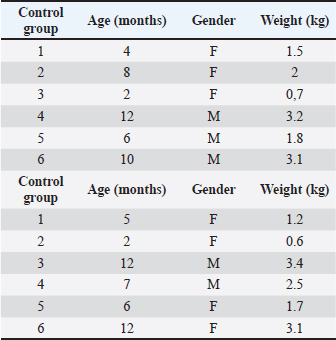 Anesthesiological and operative protocolThe cats were premedicated with atropine sulfate (0.1% Atropin, Sopharma) at a dose of 0.02 mg/kg, and applied subcutaneously. The induction of anesthesia was done by intravenous application of the combination zolazepam/tiletamine (Zoletil 50, Virbac) at a dose of 15 mg/kg, and the maintenance through inhalational anesthesia with 2.5% isoflurane with oxygen (AErrane, Baxter). Table 1. Signalment data of cats from the control and EPO groups.