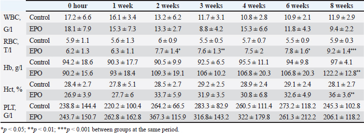 AbstractBackground: The bone regeneration potential of erythropoietin (EPO) is not yet fully investigated, but some previous experimental studies demonstrated that its application activated the differentiation of osteoblasts and promoted bone formation. Aim: The aim of the present study was to evaluate the effects of recombinant human erythropoietin (rhEpo) on bone healing in cats with fragmented long bone fractures. Methods: Twelve cats were divided into two groups—control (n=6) in which physiological saline was applied at the fracture gap site and EPO (n=6) with the application of 1,000 IU rhEpo. The effects of EPO on blood erythrocyte counts, hemoglobin content, and hematocrit were monitored by serial complete blood cell tests, whereas bone formation was evaluated by clinical and radiographic examinations on post-operative weeks 1, 2, 3, 4, 6, and 8. Results: All tested blood parameters were within the reference range. A faster fracture healing and full limb weight-bearing were observed in the EPO group, with statistically significant differences with respect to the control group. Conclusion: The obtained results confirmed that the local application of rhEpo promoted bone healing in cats with fragmented femoral fractures and increased bone callus strength without having significant systemic effects. Keywords: Bone healing, Cat, DEXA, Erythropoietin, Fracture. IntroductionErythropoietin (ЕPO)—a hormone produced by peritubular fibroblasts of the renal cortex, stimulates the production of red blood cells (RBCs) in animal and human bodies (Jelkmann, 2016). EPO-stimulating agents are recombinant versions of EPO synthesized pharmacologically in cell cultures (Schoener and Borger, 2023). Their use is indicated mainly in chronic renal failure patients with anemia syndrome or during chemotherapy of cancer patients (Bruce et al., 2022; Chung et al., 2023). The additional (pleiotropic) functions of EPO are of interest to regenerative medicine. EPO possesses an angiogenic, anti-inflammatory, cytoprotective, and anti-apoptotic effect (Trassanidou-Chatzifotiadou, 2014). Studies in the field of bone pathology demonstrated that the recombinant human erythropoietin (rhEpo) improved bone healing and may serve as a therapeutic agent promoting bone regeneration (Wan et al., 2014). There is evidence that EPO stimulates bone healing and improves bone mechanical strength (McGee et al., 2012). Its direct influence consists in the activation of the differentiation of osteoblasts, whereas the indirect effect involves stimulation of the expression of vascular endothelial growth factor (Holstein et al., 2011; Singbrant et al., 2011). Previous experimental studies on calvarial and long bones in rats showed that EPO had an osteoinductive potential and that its local application resulted in healing of critical bone defects (Chaprazov et al., 2022; Vasileva and Chaprazov, 2023). Similar studies were performed also in mice and rabbits with promising results regarding the regenerative potential of EPO (Holstein et al., 2011; Rölfing et al., 2012). Data from clinical studies are however scarce. The first research in humans with tibial and fibular fractures has analyzed the effect of rhEpo applied at the fracture site 2 weeks after osteosynthesis. The results confirmed that EPO enhanced bone healing and shortened the restoration period (Bakhshi et al., 2013). A recent preliminary study in men with periodontitis demonstrated that local EPO gel application reduced inflammation and improved the strength of the periodontal ligament (Aslroosta et al., 2021). To the best of our knowledge, there are no veterinary scientific reports on the effect of rhEpo on bone regeneration in patients. The aim of the present study was to evaluate the effects of rhEpo on bone healing in cats with fragmented long bone fractures. Materials and MethodsErythropoietinIn this study, 2,000 IU Binocrit injection solution containing 2,000 IU/ml epoietin alpha equivalent to 16.8 μg/ml (Sandoz, Kundl) was used. It is produced by re-combinant DNA technology in the Chinese Hamster Ovary cell line expression system. AnimalsTwelve cats and patients of the Small Animal Clinic, University Veterinary Hospital were included. The inclusion criterion was a recent fragmented fracture of the femoral diaphysis. Exclusion criteria were animals with systemic diseases, animals with multiple fractures, and animals, which due to the type of fracture, needed a combination of different techniques of bone fixation at the same time. The study included 12 mixed-breed cats. The average body weight of patients was 2.05 ± 0.96 kg (control group) and 2.17 ± 1.2 kg (EPO group). The respective average age of both groups was 7.0 ± 3.7 and 7.3 ± 4.3 months. There were no statistically significant between-group differences in body weight and age. The signalment data of patients are listed in Table 1. The cats were assigned to one of two groups depending on the applied treatment.