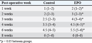 Table 3. Radiological healing scores in cats from control (n=6) and EPO-treated (n=6) groups. Data are presented as median (min-max).