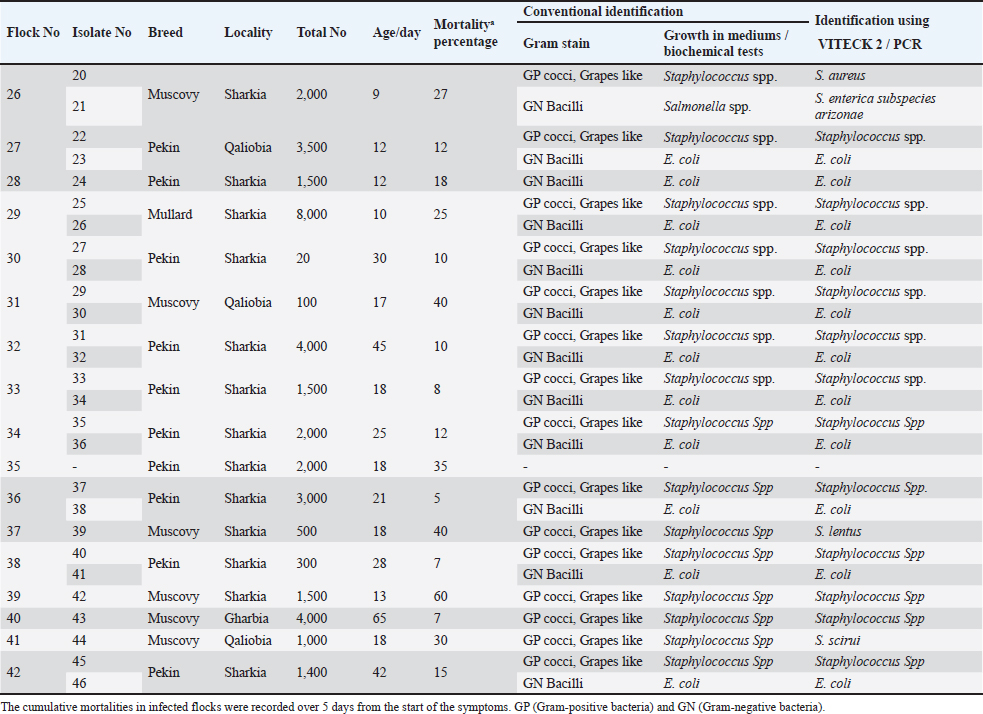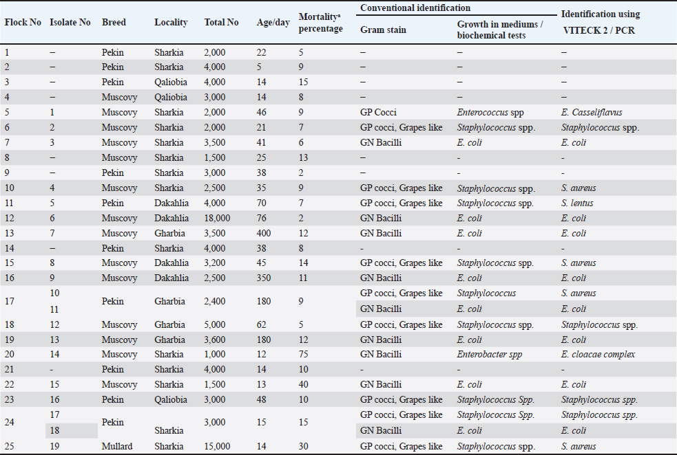 AbstractBackground: Bacterial infections causing digestive problems are among the most serious threats to Egypt's duck industry, owing to their effects on feed utilization and body weight gain. Aim: As a result, the goal of this study was to identify bacterial pathogens causing enteritis in ducks as well as testing their antimicrobials resistance capabilities. Methods: Forty-two duck flocks from different localities at four Egyptian Governorates (El-Sharkia, El-Gharbia, El-Dakahlia, and El-Qaliobia) have been subjected to clinical and postmortem examination as well as bacterial isolation and identification. The liver samples have been collected aseptically from freshly euthanized ducks for bacterial isolation followed by identification using conventional biochemical tests, VITEK 2 system, and confirmatory polymerase chain reaction (PCR) for detection of the uid A gene (beta-glucuronidase enzyme) of Escherichia coli. In addition, antimicrobial sensitivity testing for the isolates against different antimicrobials by the VITEK 2 system was used. Results: Forty-six positive bacterial isolates were identified using conventional methods and the VITEK 2 system including Staphylococcus spp. (52.17%), E. coli (41.30%), and 2.17% for each of Enterococcus casseli lavus, Salmonella enterica subspecies arizonae, and Enterobacter cloacae. PCR was positive for E. coli uid A gene at 556 bp. The antibiogram patterns of isolated pathogens from naturally infected ducks in our work demonstrated 87% multidrug resistance with varying results against different antimicrobial drugs tested. Such findings supported the fact of the upgrading multidrug resistance of Staphylococci and Enterobacteriacae. Conclusion: The most prevalent bacterial pathogens associated with duck enteritis were Staphylococcus spp. and E. coli with the first report of S. enterica subspecies arizonae causing duck enteritis in Egypt. Keywords: Duck enteritis, Staphylococci, Salmonella, E. coli, Antimicrobials. IntroductionBacterial infections in ducks have higher incidence rates compared with viral diseases. Mortality rates of bacterial infections have increased globally (Enany et al., 2018). The studies have concentrated on determining the intestinal load of pathogenic bacteria such as Staphylococci spp., Escherichia coli, and Salmonellae spp. (Cao et al., 2008). Ducks with bacterial infection experience diarrhea, lack of coordination, depression, dehydration, and a high mortality rate. In the poultry business, these illnesses result in great financial losses for various regions of the world (Brans and Gross, 1997). Staphylococci inhabit the skin and mucosal surface of the most critical organs of mammals and birds (El-Jakee et al., 2008). In poultry, it produces considerable economic losses in a variety of ways, including septicemia, lower body weight, decreased egg production, and osteomyelitis, which result in lameness and carcass condemnation at slaughter (McNamee and Smyth, 2000 and Andreasen, 2008). Escherichia coli infects ducks of all ages, causing septicemia with a death rate of 10%–50%. Young ducklings are more commonly affected, and mortality rates in birds aged 4–9 weeks can approach 20%. Colibacillosis is manifested either as a systemic or localized form. Pericarditis is commonly seen in colisepticemia. The pericardial sac becomes cloudy and the epicardium becomes edematous and covered with a light-colored exudate (Saif et al., 2010). Also, congested spleen, perihepatitis, airsacculitis, and enteritis have been recorded by Aggad et al. (2010). The localized form may be in the form of coliform omphalitis/yolk sac infection (Montagomery et al., 1999), coliform cellulitis (Gomis et al., 2000), swollen head syndrome (Van de Zande et al., 2001), diarrheal disease (Saif et al., 2010), or venereal colibacillosis (acute vaginitis) (Gerardian et al., 2000). Salmonellosis is a dangerous duck disease with clinical symptoms more common in very young ducklings and more prevalent in the immediate post-hatched period (Henry, 2000). The clinically affected ducklings showed depression, inappetence, huddling together, loss of weight, closed eyes, and a staggering gait appeared 72 hours post infection, which was followed by tremors, droopy wings, diarrhea, and feather pasting around the vent (Mondal et al., 2008). Ducklings with salmonellosis have postmortem findings that range from no grossly evident lesions to a septicemic picture with congestion of the internal organs, including the liver, spleen, lungs, and kidneys. Typhlitis, pericarditis, and perihepatitis are also frequently seen (Lister and Barrow, 2008). Discrete necrotic lesions in the lungs, liver, and heart may be observed. Birds that survive the acute septicemic phase of the infection may have peritonitis and hemorrhagic enteritis (Pattison et al., 2008). The VITEK 2 system is considered an efficient and dependable method for carrying out bacterial identification and testing for antibiotic susceptibility. The polymerase chain reaction (PCR) is a very sensitive technique for identifying different pathogens in clinical samples. Numerous PCR assays have been created to detect and identify bacterial pathogens in ducks (Gomis et al., 2003). Since most bacterial illnesses in duck flocks cannot be totally prevented by vaccination, antibiotics are often recommended as a control measure. In the poultry industry, improper usage of antibiotics results in higher rates of resistance, leading to the growth of multidrug-resistant bacteria and subsequently raises concern (Ammar et al., 2021). This study aims to identify the bacterial pathogens incriminated in the duck enteritis problem using conventional biochemical tests, VITEK 2 system as well as PCR. Furthermore, the study assesses the antibiotic sensitivity of the identified pathogens. Material and MethodsExamined birdsForty-two duck flocks from four Egyptian governorates (EL-Sharkia, El-Gharbia, El-Dakahlia, and El-Qaliobia) suffering from en