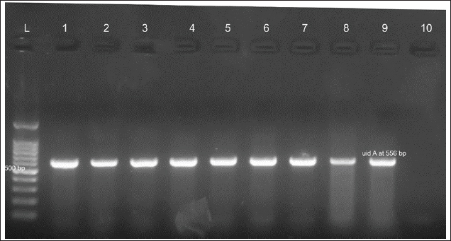 Figure 2. Agarose gel electrophoresis of the PCR products of E. coli :Lanes L: 100 bp ladder, 1: 13, 2: 18, 3: 23, 4: 28, 5: 30, 6: 32, 7: 34, 8: 36, and 9: positive control uid A at 556 bp. 10: negative control. The E. cloacae complex isolate showed high sensitivity to amikacin, fosfomycin, difloxacin, piperacillin/tazobactam, meropenem, and imipenem; moderately sensitive to ticarcillin/clavulanic acid and tobramycin, and resistant to ampicillin, piperacillin, ticarcillin, cephradine, ceftazidime, cefepime, aztreonam, gentamycin, streptomycin, erythromycin, spiramycin, ciprofloxacin, levofloxacin, minocycline, doxycycline trimethoprim/sulfamethoxazole. Interestingly S. enterica subspecies arizonae isolate showed high sensitivity to amikacin, gentamycin, ciprofloxacin, difloxacin, levofloxacin, minocycline, doxycycline, fosfomycin, piperacillin, piperacillin/tazobactam, meropenem, imipenem, ticarcillin, ticarcillin/clavulanic acid, tobramycin, ceftazidime, cefepime, aztreonam, and trimethoprim/sulfamethoxazole, and resistant to cephradine, colistin, ampicillin, streptomycin, erythromycin and spiramycin. Results of antimicrobial resistance testing show an increase in the number of isolates causing duck enteritis that is multidrug resistant, with 87% of the tested isolates having resistance to five or more antimicrobials (Table 2). DiscussionEnteritis is a devastating disease for the poultry performance particularly in ducklings which subtracts from the economic outcome of this poultry sector. Consequently, the bacterial agents causing duck enteritis among 42 flocks from four Egyptian governorates (Sharkia, Gharbia, Dakahlia, and Qliobia) were investigated. The birds were subjected to clinical examination and bacterial and molecular identification as well as antimicrobial testing using VITEK 2. The frequently observed clinical signs among the examined flocks were watery, whitish, bloody, and greenish diarrhea. The obtained results were analogs to that previously recorded by Ibrahim, (2003) who infected 14-day-old ducklings intranasal with 7.5 × 106 cfu E. coli O86:K61 experimentally and noticed whitish and greenish diarrhea 48 hours post infection. The clinically affected ducklings showed diarrhea with pasting of feathers around the vent which is comparable with Barrow et al. (1999) findings that isolated and identified Salmonella typhimurium from ducklings during the first 2 weeks of life in the United Kingdom. Most of the flocks under examination had respiratory distress, labored breathing, and gasping. The obtained results were parallel to those previously stated by Abd El-Samie et al. (2019) who observed respiratory symptoms in 40 diseased ducks of different ages (1–8 weeks old) in Sharkia governorate, Egypt, between June and September 2018 affected by colibacillosis. The necropsy revealed enteritis in the ducks under investigation. Similarly, Abd El Tawab et al. (2015) observed enteritis in ducks infected with S. Inganda, S. Infantis, and S. Larochelle in the Egyptian governorates of Dakahlia and Damietta. In addition, in this study, increased pericardial fluid, pericarditis, and serofibrinous perihepatitis were noted as necropsy findings and these results were agreed with Aggad et al. (2010) who isolated E. coli from 1 to 8-week-old chickens in western Algeria. The results were also consistent with those reported previously by Abd El-Samie et al. (2019), who noted air sacculitis, pericarditis, perihepatitis, and peritonitis in young diseased ducks suffering from colibacillosis in Sharkia governorate, Egypt, between June and September 2018. Bacterial isolation, bacterial identification utilizing (VITEK 2), and confirmatory PCR were carried out to evaluate the bacterial etiology of enteritis in the examined ducks.