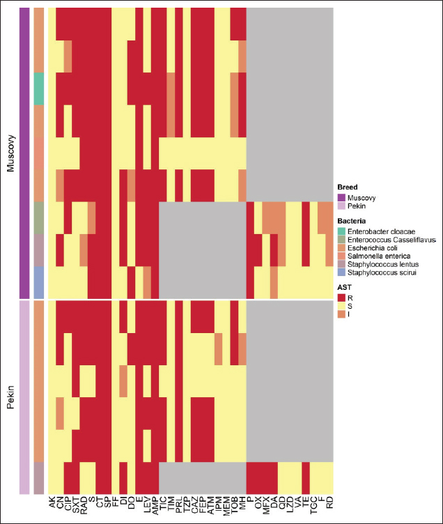 Figure 3. Heatmap representation of isolates source and antimicrobial resistance patterns. In this study, the examined livers yielded 46 bacterial isolates identified as follows Staphylococcus spp (52.17%), E. coli (41.30%), and the least percentage of 2.17% for E. casseliflavus (S. enterica subspecies arizonae and E. cloacae complex). These results were obtained by Bisgaard (1981) who isolated a higher percentage of Staphylococcus species than E. coli from ducks (Mallard, Muscovy, and white Pekin) at the age of 55 days. Also, partially agreed with Safwat et al. (1986) who isolated Salmonella, E. coli, Enterobacter species, and Pasteurella multocida from the internal organs of 150 balady ducks (4 weeks old) at a percentage of 19%, 15%, 13.3%, and 5%, respectively. The inability to isolate Pasteurella in our study may be due to medicated or vaccinated flocks. The second highest percentage of isolated bacteria in this study was E. coli (41.30%). This result was agreed with Asway and Abd-El latif (2010) who isolated E. coli from the internal organs of ducks with a higher percentage in the liver (42.5%). Table 2. Resistant proportions of 15 isolates from ducks with enteritis.