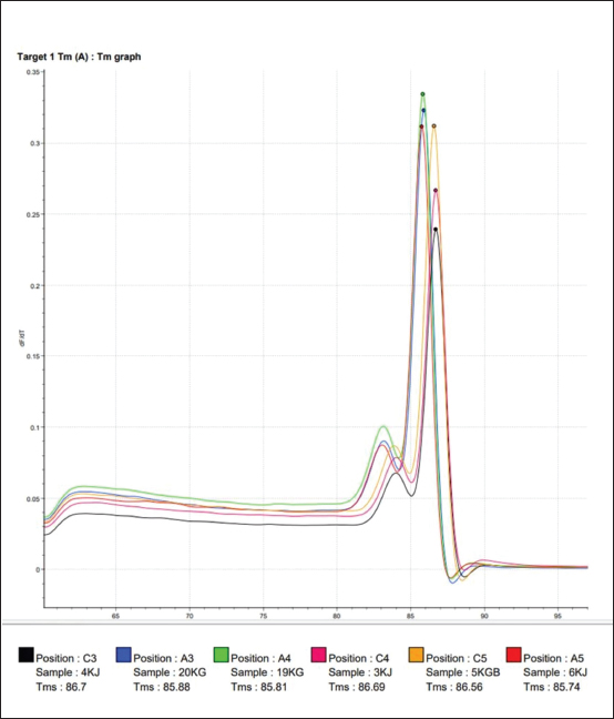 Fig. 2. Melting temperature (Tm) value from amplification using the SYBR Green method for working horse feces samples on Sumbawa Island using the E. coli 0157; H7 chuA gene primer. Color description: Red: 3KJ, Black: 4KJ, Orange: 6KG, Green: 19KG, Blue: 20KG, Yellow: 5KGB. The use of specific probes will help increase the specificity of the qPCR test; however, qPCR requires relatively expensive equipment and reagents, and requires good understanding and correct techniques to get accurate results. qPCR has the working principle of detecting and quantifying fluorescent reporters. The signal from the fluorescent will increase as the DNA amplification product increases in the reaction. Reactions during the exponential phase can be monitored by observing and recording the amount of fluorescent emission in each cycle. The increase in the amplification curve in the exponential phase is closely related to the number of target gene initiations. Therefore, the higher the expression level of the target gene, the faster the detection of fluorescent emissions will occur (Hewajuli and Dharmayanti, 2014). An amplification curve will appear and form during the amplification process. The function of the amplification curve itself is to determine whether amplification occurs in the thermal cycler used. This amplification is determined based on the intensity of the fluorescent, that is, if more amplification products are produced, the greater the accumulation of fluorescent that will be read (Pratama, 2015). qPCR has high sensitivity and has advantages compared to conventional PCR. qPCR is considered more dynamic, can be used for more testing, and has less risk of contamination. The results of amplification with the primer chuA gene of the invasive enterohemorrhagic species E. coli 0157:H7 using the Go Tag Master Mix protocol (GoTaq® 1-Step RT-qPCR System) and quantification kit will answer the core problem of this research, whether the chuA gene of invasive species is present and detected enterohaemorrhagic E. coli 0157:H7 in fecal samples of working horses on the island of Sumbawa. In addition, many molecular-based analysis methods can be used because of the fast process and results in research, one of which is the DNA-based method which has been widely developed, such as fingerprinting using PCR, multiplex PCR assay, and real-time PCR; this method has been widely used for several last decades (Manalu and Rohman, 2019). The results of DNA amplification of the chuA gene of the invasive enterohemorrhagic species E. coli 0157:H7 using qPCR can be used as an analysis to detect the presence of DNA other than in horse feces. This is because the use of hydrolysis probes can be used for multiplex qPCR using target DNA and more than one partner in a reaction. After all, the probe will bind specifically to several different target DNAs (Harisah, 2017). The increasing amplification curve shows an increase in the concentration of DNA paired with the primer being tested. The increase in this curve occurs due to an increase in fluorescent light when it binds to double-stranded DNA. The resulting fluorescence is appropriate and proportional to the amount of amplified template DNA (Rasyid, 2015). To test the specificity of the chuA primer using the SYBR green method, followed by analyzing the Tm value. The Tm value resulting from amplification using the SYBR Green method using the chuA primer can be seen in Figure 2. DNA isolates from workhorse feces samples with sample codes 3KJ and 4KJ have the same Tm value, namely at a temperature of 86.7°C. The Tm values of sample codes 6KJ (85.74), 19KG (85.81), and 20KG (85.88) have almost the same Tm values. Isolate with sample code 5KGB with a Tm value of 86.56. The highest Tm value was found in the isolate with sample code 4KJ (86.7) and the lowest Tm value was found in the isolate with sample code 6KJ (85.74). The Tm value is the Tm of the amplification target DNA. A good primer pair is that the two primers have a difference in Tm value of no more than 2°C. Thus, the bovine primers for analyzing bovine meat and gelatin DNA using the SYBR green method are specific primers (Smith and Osborn, 2008). Melt curve analysis is carried out by increasing the temperature until it reaches the melting temperature, 50% of double-stranded DNA will separate into single strands at this melting temperature (Nur’utami, 2011). Single-stranded DNA will bind to the specific primer chuA while non-specific double-stranded DNA will bind to SYBR green. Based on the melt curve in Figure 2, the six samples tested show that the melting temperature values are different and there are three melt peaks. Amplicons originating from the same target DNA will have almost the same Tm value. The qPCR method for this parameter was proven to identify the chuA gene as the coding gene for the invasive enterohemorrhagic species E. coli 0157:H7. This is following research that has been carried out previously using the same method (Septiani and Pandianto, 2018), which states that the qPCR method is fast and reliable so it is appropriate to use it as a method to detect the presence of the invasive enterohemorrhagic species E. coli 0157:H7 in the feces of working horses in Sumbawa Island. ConclusionIn conclusion, the qPCR method can amplify the DNA of the chuA gene as a gene encoding the invasive enterohaemorrhagic species E. coli 0157:H7 using specific primers, with a denaturation temperature of 95°C for 10 seconds, annealing of 52°C for 30 seconds, and a temperature of 72°C for 30 seconds. An increase in the amplification curve occurred in all samples tested, based on the DNA amplification curve with qPCR of horse feces samples on the island of Sumbawa, the invasive enterohemorrhagic species E. coli 0157:H7 was detected. This research confirms that there is an invasive species of enterohemorrhagic E. coli 0157:H7 originating from the feces of working horses on the island of Sumbawa. Working horses are an important