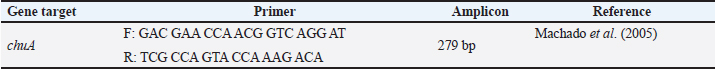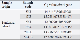 AbstractBackground: Bacterial identification can be done using various testing techniques. Molecular techniques are often used to research dangerous diseases, an approach using genetic information on the pathogenic agent. The enterohemorrhagic invasive species Escherichia coli 0157:H7 was identified from the feces of working horses on the island of Sumbawa. Another advance in molecular technology is genome amplification with qPCR which is the gold standard for detecting E. coli. Aim: This study aims to detect and identify the invasive species E. coli 0157:H7 using the gene encoding chuA with the qPCR method sourced from horse feces. Methods: Fresh fecal samples from horses on Sumbawa Island were isolated and identified, then continued with molecular examination using the gene encoding chuA using the qPCR method. Results: qPCR testing in this study showed that six sample isolates that were positive for E. coli 0157:H7 were detected for the presence of the chuA gene, which is a gene coding for an invasive species of E. coli bacteria. The highest to lowest Cq values and Tm from the qPCR results of the sample isolates were 15.98 (4KJ), 14.90 (19KG), 14.6 (3KJ), 13.77 (20KG), 12.56 (5KGB), and 12.20 (6KJ). Tm values are 86.7 (4KJ), 86.69 (3KJ), 86.56 (5KGB), 85.88 (20KGB), 85.81 (19KG), and 85.74 (6KJ). Conclusion: Validation, standardization of the development, and modification of qPCR technology must be carried out to harmonize testing throughout to avoid wrong interpretation of the test results so that the determination of actions to eradicate and control diseases originating from animals in the field does not occur. Keywords: Escherichia coli 0157:H7, chuA, qPCR, Horse, Invasive. IntroductionThe majority of facultative organisms in the gastrointestinal system are Escherichia coli. Due to the presence of particular virulence factors and genes linked with pathogenicity that are typically absent in other E. coli, pathogenic strains of E. coli can cause a range of diarrheal illnesses in hosts. However, some strains of E. coli can also lead to further intestinal infections (Darvishi et al., 2020). E. coli is a common cause of meningitis, septicemia, diarrhea, and outpatient urinary tract infections (UTIs) in women worldwide (Pokharel et al., 2023). Various diseases found in animals and humans are caused by many pathogenic strains invasive enterohemorrhagic of E. coli, although most of them coexist in safe symbiosis (Hu et al., 2022). However, the majority of them coexist in safe symbioses. Community- and nosocomial-related UTIs are primarily caused by E. coli. The second most typical infectious presentation in general practice is UTI. There is growing concern over the emergence and dissemination of different antibiotic resistance mechanisms among prevalent human pathogenic Enterobacteriaceae members, reducing the number of treatment alternatives (Boucher et al., 2009). A significant clinical issue is the ongoing rise of antibiotic resistance among clinical bacterial strains. The most significant danger to managing infectious diseases is the rapid growth of antibiotic resistance among common pathogens (Adamus-Bialek et al., 2013). In addition to sepsis, newborn meningitis, gastroenteritis, and several infections, such as UTIs, pathogenic strains of E. coli can cause a wide range of intestinal and extra-intestinal disorders (Coura et al., 2015; Khan et al., 2017). The respiratory system is the second most common reported illness, while UTI is one of the most prevalent bacterial consequences. Escherichia coli is the most prevalent bacteria that can infect the urinary system. 80%–90% of UTIs are caused by E. coli, which is still the most common bacteria in the urinary tract worldwide (Lee et al., 2016). According to an in vitro genome analysis of E. coli strains belonging to various phylogenetic groups, particular genes or bacterial DNA fragments can be utilized as specific markers for the phylogenetic classification of the E. coli strain (Coura et al., 2017). The chuA gene, which is required for the transmission of invasive enterohemorrhagic species E. coli O157: H7, is present in three proposed particular markers. qPCR is employed as a straightforward and quick method with higher sensitivity and specificity because other techniques need more involved and time-consuming procedures needing a collection of model strains (Gordon et al., 2008). According to host niche, pathogenicity, antibiotic resistance, and most significantly certain virulence factors, bacteria exhibit distinct characteristics (Shaheen et al., 2013). Horses are non-ruminant herbivorous mammals with one-toed hooves that belong to the Equidae family. These animals are well-built and capable of covering lengths of up to 16 km per day, making them popular choices for usage as draft animals and riders (Wibisono et al., 2017). In Indonesia, riding horses and horse-drawn carriages are common forms of transportation for equines ( Equus caballus Linnaeus, 1758). This animal serves as a vital mode of transportation and a source of money for the neighborhood. Observations show that Sumbawa Island has many working horses, many of which are employed for transport and serve as a tourist draw in and of themselves. The upkeep of working horses necessitates consideration for the implementation of animal welfare based on upholding the five principles of animal freedom (the “five freedoms”), free from harm, illness, and disease, one of which is infection by microorganisms that cause disease in horses and reduce the performance and productivity of working horses (Scala et al., 2020). Materials and MethodsSample collectionA total of 52 samples of working horse feces from Sumbawa Island, the province of west Nusa Tenggara, Indonesia. Samples were collected and put into buffered peptone water media, and each sample was labeled and explained accordingly. In the sample transportation process, all sample specimens were put into a coolbox containing a