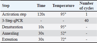 DNA amplification using a hydrolysis probe is carried out with the following procedure. Hydrolysis probe mastermix was prepared with a total volume of 20 μl consisting of 5 μl of tested DNA; 1.4 μl aquabidest; 1.6 μl forward primer 10 μM; 1.6 μl reverse primer 10 μM; 0.4 μl 10 μM probe; and 10 μl LightCycler® 480 Probe master (Taq DNA Polymerase enzyme, dNTP mix, and 6.4 mM MgCl2). A total of 5 μl of DNA was to be tested and 15 μl of mastermix was put into a multiwell plate. The mixture is homogenized. Next, real-time PCR is turned on, program settings are carried out, and the tool is run (Roche, 2008). Ethical approvalNot needed for this study. ResultsThe qPCR method is an accurate and efficient method used to detect the presence of DNA more specifically for the detection of the chuA gene as the gene encoding enterohaemorrhagic invasive species E. coli 0157:H7 in feces samples from working horses on the island of Sumbawa. The results of this test explain the general conditions of the research, DNA amplification of working horse feces samples using qPCR. Sample analysis is important to obtain data quality. This is related to the implementation of quality assurance (QA) and quality control (QC) systems to ensure that the working system can run correctly and appropriately so that the data obtained is of good quality. Apart from QA and QC, an important factor in obtaining data quality is to carry out validation analysis to determine the accuracy of the tests carried out, namely standardized and optimized correctly and appropriately (Hewajuli and Dharmayanti, 2014). The following are the results of the Cq (quantification cycle) values in horse feces samples on Sumbawa Island which experienced an increase in the amplification curve. DiscussionThe method for detecting the chuA gene of enterohaemorrhagic invasive species E. coli 0157:H7 using the qPCR method can be carried out using the pre-enrichment method and without the pre-enrichment method. In this research, pre-enrichment was used. The pre-enrichment stage aims to increase the number of bacteria because PCR protocols generally require very high concentrations of target microorganisms which are usually obtained only after sample enrichment (Garrido-Maestu et al., 2020). The pre-enrichment stage is important as an effort to reduce negative errors in testing (Nurjanah et al., 2021). qPCR is a reliable, effective, and reliable DNA-based analysis method (Zilhadia et al., 2017). This method has the advantages of being able to identify small samples, not having to visualize, the risk of contamination is small and can examine a large number of samples at once (Zhang et al., 2021). qPCR with SYBR Green fluorescent staining is a detection method and is also able to differentiate between fresh and processed products (Law et al., 2015). Analysis of DNA amplification from qPCR results based on the cycle threshold (Ct) value on the amplification curve. Ct is the number of cycles the sample begins to be read which indicates the beginning of the exponential growth phase. The lower the Ct value, the higher the amount of target DNA. Conversely, the higher the Ct value, the lower the amount of target DNA. The results of DNA amplification using qPCR on the E. coli 0157:H7 isolate sample carried out with SYBR green staining were seen through the increase in the curve and the Ct value on the amplification curve. The specificity of the amplification results can be seen through the Tm value on the melt curve (Zilhadia et al., 2017). Table 3. Results of Cq values in fecal samples from working horses on the island of Sumbawa.