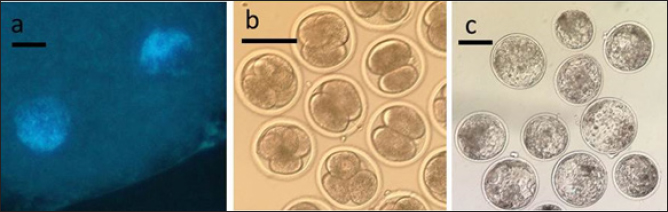 Fig. 2. Representative photographs of 2 PN zygotes (a, scale bar represents 10 μm), cleaved embryos after 48 h-culture (b, scale bar represents 100 μm), and blastocyst after 7 day-culture (c, scale bar represents 100 μm). Table 1. Oocyte survival and 2 PN formation rates in oocytes activated using bovine or human sperm. Numbers in parentheses represent percentages.