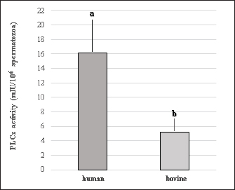 Fig. 3. PLCɀ activity in human and bovine sperm cells. a, b Different superscript over bars indicate significant differences (p < 0.05, mean ± S.E.M., n=9 for each treatment in three replicates). Conventional ICSI using bovine or human sperm resulted in similar 2 PN formation and cleavage rates. But surprisingly, Piezo-ICSI using human sperm resulted in significantly higher two PN formation and initial embryo development in comparison with bovine sperm, indicating that human sperm cells possess some physical or chemical characteristics that favor oocyte activation and therefore ICSI outcomes. Interestingly, the release of some sperm factors seems to be higher when using Piezo pulse during ICSI in both sperm species, improving the results obtained with conventional ICSI procedures. To successfully activate the oocyte, sperm oocyte activation factors (SOAFs) must be released from the post-acrosomal perinuclear theca (PT). This event triggers calcium release from the oocyte’s endoplasmic reticulum, initiating a signaling cascade leading to meiotic resumption, activation of anti-polyspermy mechanisms, PN formation, and finally embryo cleavage and embryo development (Sutovsky, 2018). Although ICSI can apparently produce normal offspring in several species, this process circumvents some biological processes necessary for normal fertilization, such as the loss of the acrosomal vesicle and sperm plasma membrane, and the oocyte-sperm interaction and fusion. The retention of these structures may be harmful to the oocyte or delay its activation (Morozumi et al., 2006). The use of the Piezo system may promote a faster dissolution of the sperm membrane facilitating the efflux of SOAFs after the injection (Salgado et al., 2018). Sperm-specific PLCɀ is widely considered the main SOAF responsible for generating calcium oscillations that induce oocyte activation and embryonic development during mammalian fertilization (Saleh et al., 2020). We compared PLCɀ activity between bovine and human sperm cells, finding that human sperm possess thrice as high PLCɀ activity as bovine sperm. This higher PLCɀ activity may explain the higher fertilization rates obtained when using Piezo-ICSI and human sperm to activate bovine oocytes. Therefore, we can suggest that the low results obtained with ICSI are not just a consequence of bovine oocyte activation problems (Malcuit et al., 2006; Aguila et al., 2017), but also a lower PLCɀ activity in the bovine sperm than the needed for oocyte activation after ICSI. On the other hand, the oocyte is fully competent when activated by a different signal mechanism during IVF, where sperm and oocyte membranes interact and fuse with each other. Although the molecular events underlying these processes are not fully understood, previous sperm capacitation and acrosome reaction would be involved (Breitbart, 2003). We observed a considerable increase in bovine oocyte activation when human sperm was used for Piezo-ICSI, but not with bovine sperm. This suggests that Piezo-ICSI could facilitate PLCɀ release from human sperm and, therefore, allow PLCɀ dependent cell signaling pathway activation. It has been reported that the complete solubilization of post-acrosomal PT, where PLCɀ is stored, is necessary for oocyte activation. Therefore, the greater rigidity of the PT and the higher nuclear stability of the bovine sperm could difficult the solubilization of the PT contents (Sutovsky et al., 2003), impairing the replacement of sperm protamines by oocyte-derived histones, an essential requirement for male PN formation (Unnikrishnan et al., 2021). The tight condensation of the sperm nucleus is the result of the binding of DNA to protamines. In mammalian spermatozoa, two different types of protamines exist, protamine 1 and protamine 2, the former presenting a greater affinity for DNA due to its higher cysteine content than the latter (Brewer et al., 2003; Hutchison et al., 2017). Human and mouse sperm present protamine 1 and 2, while bovine sperm have only protamine 1, making the nuclear chromatin very stable (Unnikrishnan et al., 2021). In this way, sperm with a higher proportion of protamine 2, as human sperm, decondensed faster in comparison with bovine sperm, being this a possible explanation for the higher two PN formation and cleavage rates observed when bovine oocytes were Piezo injected with human sperm. This increased stability of the bovine sperm may compromise or delay the release of PLCɀ within the oocyte and therefore may not trigger oocyte activation in the proper way. Considering this, previous treatment of the spermatozoa to remove the acrosome and the plasma membrane may facilitate sperm decondensation, PN formation, and a faster release of PLCɀ (Malcuit et al., 2006; Zambrano et al., 2016). In conclusion, our results indicate that the higher stability of the bovine sperm in combination with its relatively low content of PLCɀ would not allow efficient oocyte activation after ICSI. The Piezo system increases bovine ICSI efficiency, augmenting two PN formation and cleavage rates, but outcomes are still lower in comparison with the results obtained after the chemical activation of the oocyte. Further studies are necessary to increase the efficiency of ICSI in the bovine, considering that the failure after ICSI seems to be in part due to the incomplete activation of PLCɀ dependent cell signaling pathway by bovine sperm. An alternative could be the evaluation of the combined use of the Piezo system with PLCɀ injection or supplementation during ICSI. Therefore, an earlier beginning of calcium oscillations, oocyte activation, and consequently a more coordinated formation of female and male PN could be obtained. AcknowledgmentsThe authors acknowledge Centro de Reproducción Bovina SRL for donating frozen bovine sperm straws. Conflict of interestThe authors have declared that there is no conflict of interest concerning this study. FundingThis research was supported by fun