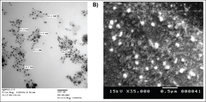 Fig. 3. A) TEM image of AgNPs-FG, Magnification power 100,000× and scale bar represented 100 nm; B) SEM image of AgNPs-FG, Magnification power 35,000× & 20,000 and scale bar represented 0.5 μm.