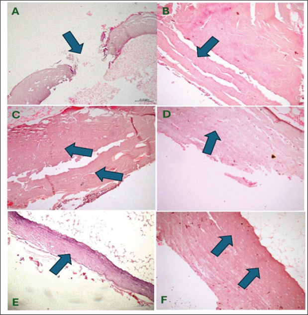 Fig. 7. Group of pictures showing the starting point of fracture and progress in healing at different groups with observable mature bone formation on the fourth week at both groups 2 and 4 (PICTURES E &F). (A)-Observable fracture gap (induced) at the site of bone defect in control and other treated groups (×100, H & E) at week zero post-operatively. (B) Fibrous tissue formation (started healing soft callus) is observable in the second week at the control, and group-3 of the tested groups (×200, H & E), (C) and (D) Immature bone formation (woven bone: Hard callus) advanced healing stage is observable in the second week post-operatively at group-2 (C), at group-4 of the tested groups (D) (×200, H & E). (E) and (F) Mature bone formation is observable (full healing stage) in the fourth week in group 2 (E) and group 4 (F) (×100, ×200 H & E; respectively). AgNO3 + Na3C6H5O7 + H2O →Ag+ + e- → (Nucleation & Size growth) + (Stabilization) → AgNPs-FG Eq 2 The absorption wavelength indicates the nano colloid size of AgNPs-FG (Abdellatif et al., 2018a; Abdellatif, 2020). Due to free electrons that cause the surface plasmon to be excited and produce the resonance of the SPR band, the produced AgNPs-FG displayed unique absorption peaks (Ranoszek-Soliwoda et al., 2017; Younis et al., 2022). The AgNPs-FG UV-VIS spectra revealed a progressive redshift, and the obtained absorption peak was broad, presumably due to the heterogeneous character of the produced NPs, as proven by the DLS curve. Color changes indicate variations in the absorption wavelength range of the nano preparations compared to the FG (Fig. 7). Also, the maximum wavelength shifts of the absorption band occur due to the nanospheroids’ diameter increase (Abdellatif et al., 2022a–c). AgNPs-FG is created using various substances such as catalysts, biogenic materials, and synthesis facilitators. These play an important role in reducing and stabilizing silver ions and affect the morphology and charges of the final product (Abdellatif et al., 2020a, 2022d). Even though the produced AgNPs-FG has a lower value of zeta potential, a further stabilizing action could be applied upon incorporation into the starch hydrogel base. The size of AgNPs-FG was smaller in TEM than in light scattering analysis because the latter method measures the mean size hydrodynamic diameter and adds surface structure concentration, resulting in a larger size (Abdellatif et al., 2020b; Tawfeek et al., 2020a). AgNPs-FG and FG Hydrogels have considerably accepted physicochemical characteristics to facilitate their application and be suitable for patients’ use. The measured pH of the hydrogel is considered one of the common quality attributes that could affect the applied area through irritation. Herein, the prepared hydrogels had a pH value relatively equivalent to the pH value of normal skin tissue. This means that the prepared hydrogels with AgNPs are more suitable for topical administration which coincides with previous similar studies (Tawfeek et al., 2020b; Abdellatif et al., 2023). Viscosity is critical for describing the gels as it affects the extrudability and release of incorporated medicaments (Tawfeek et al., 2020a). Spreadability is vital to donate the area where gel readily spreads on the application of skin or affected area (Abdellatif et al., 2018b; Tawfeek et al., 2020a). Higher spreadability values of the AgNPs-FG hydrogel concomitant with lower viscosity could indicate that the gel is easily spreadable by a small amount of sheer (Abdellatif and Tawfeek, 2016; Tawfeek et al., 2020a). In addition, the release of silver ions is much more facilitated than FG hydrogel with a high viscosity value. It was also reported that gels with lower viscosity exhibited a higher spreadability (Mekkawy et al., 2017). The non-Newtonian pseudoplastic flow system is characteristic of hydrogel formulations (Lopez-Carrizales et al., 2020). The obtained pseudoplastic flow is a shear-thinning system, meaning a constant flow of hydrogel upon application of shear and recovery after the stress removal (Guvendiren et al., 2012). Such behavior is important for gels used for topical drug delivery applications (Mekkawy, 2013). Sterile dosage forms are essential for the safety of injectables, implants, and ophthalmic products. Striking sterility in aseptic manufacturing requires the supply of presterilized consumables, transfer of product containers, and compliance with regulatory requirements (Singh and Mehta, 2020). Starch was added directly to the hot and sterile AgNPs-FG solution to keep our preparation sterile to keep the hydrogel sterile from bacteria and pyrogen. The hydrogel was formed after boiling at more than 100°C. This degree of temperature is suitable for killing microorganisms. The bacteria were reported to stop growing at 63°C (Leszczewicz and Walczak, 2019). The AgNPs-FG and FG hydrogel was formed under sterile conditions and stored without a flask opening. The obtained AgNPs-FG and FG hydrogel showed no infection in all tested groups. Moreover, the tested groups were compatible with the prepared AgNps-FG and FG hydrogel. This step made our preparation ready to be injected or implanted in bone for further steps. Although the pharmaceutical industry has been developing worldwide. Nowadays, more than 80% of the population in the world counts on plant-based medicine for their primary healthcare. Currently, plants and their products are important in traditional and pharmaceutical medicine (Ekor, 2014; Davoodi et al., 2020; Syed et al., 2020). AgNPs can overcome the limitations associated with conventional NPs by employing passive targeting once the disease has been located (Abdellatif and Tawfeek, 2018). The healing process of bone fracture is controlled by various mechanisms such as biomechanical, cellular, hormonal, and pathological mechanisms. Although healing is a spontaneous physiological process, previous studies have used various methods to speed up the 