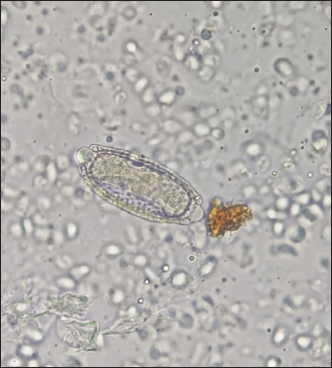 Fig. 2. Egg compatible with Capillaria spp. in a urine sample of Leopardus pardalis. DiscussionThe Leopardus lineage comprises seven species of small spotted felines distributed throughout South and Central America. These species are closely related, and although some literature reports indicate that mitochondrial cytochrome B sequencing is not sufficient to differentiate between sister species since interspecific distances are lower than intraspecific diversity (García-Alaníz et al., 2010); however, the use of genetic markers (COI, COII, COIII, Cytb, ND1-6, 4L, ATP6, ATP8, lrRNA, srRNA) depends on the species to be identified, for which an analysis of previous genetic reports must be carried out (Janczewski et al., 1995; Masuda et al., 1996; Adrados et al., 2019). In the present study, the genetic identity of the individual (Leopardus pardalis) was established and validated based on the use of the COI marker. This mitochondrial and universal marker has been used more frequently due to its advantages such as: high variability, durability, and small size. (Linacre et al., 2011). According to the branch supports of the phylogenetic tree (Fig. 4) and the pairwise distance analysis (Table 2), it was possible to establish that the sample OR345322 corresponds to the Leopardus pardalis clade.
