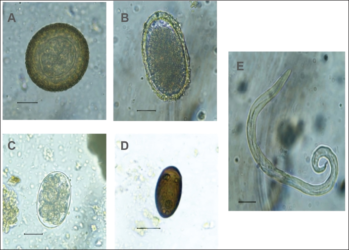 Fig. 3. Coproparasitological findings. Parasites found in Leopardus pardalis. (A) Toxocara cati, (B) Ascaridea, (C) Ancylostoma, D) Dicrocoelium spp., and E) a larva in feces sample. The hematological profile showed that no altered values were identified in relation to the morphology of the red blood cells or their hemoglobin concentration. Regarding white blood cells, a slight leukopenia was identified at the expense of incipient lymphopenia and neutropenia. However, the study did not consider that these differences are biologically relevant. These findings contribute to the development of reference patterns of wild animals, contributing to the findings previously described in Brazil that resemble the reference values established for animals in captivity (Widmer et al., 2016; ISIS, 2023; Species 360, 2023). Blood chemistry analyses in the literature report differences between the reference values of animals in captivity compared to animals in the wild (Widmer et al., 2016; ISIS, 2023; Species 360, 2023). In the case of the ocelot in this report, most results are within the normal ranges established for animals in captivity. However, when comparing the results of the analytes of the feline in this work with the reference values established for ocelots in the wild, a hypoglobulinemia value of 43.9 g/l was found (Ref. Values 50–90.9 g/l in Widmer et al. (2016)); creatinine with a value of 145.86 µmol/l (61–114.9 µmol/l in Widmer et al. (2016)) and urea with a value of 10.01 µmol/l (0.01–0.12 µmol/l in Widmer et al. (2016)) were elevated. Moreover, cholesterol levels were also elevated (24.57 mmol/dl) when compared to the reference values in the wild (Ref. Values 3.4–6.1 mmol/L in Widmer et al. (2016)) and in captivity (Ref. Values 3.39–14.54 mmol/L in ISIS (2023), and 2.35–7.80 mmol/L in Species360 (2023)). Furthermore, an elevated amylase value was registered compared to the reference values in captivity. With these results, kidney failure is suspected since elevated urea and creatinine values associated with a decreased urinary density with moderate dehydration are clinical indicators of a kidney function disorder. However, the current study did not carry out follow-up, monitoring, or treatment of the ocelot. Therefore, a diagnosis of the health status of the animal could not be made (Sparkes et al., 2016).