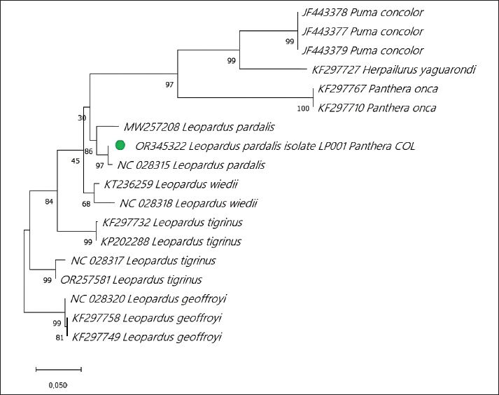 Fig. 1. Anesthetized ocelot during clinical evaluation, sample collection, and anesthetic monitoring. DNA extractionDNA was extracted from the blood sample. The entire volume contained in the EDTA microtainer was transferred to a 1.5 ml tube and incubated at 55°C for 20 min with 25 μl of proteinase K and 250 μl of BLU buffer. The extraction was continued according to the manufacturer’s instructions (HigherPurity™ Blood DNA Extraction Kit - Canvax Biotech). The sample was preserved in 30 μl of elution buffer. The sample was quantified in a NanoDrop™ 2000/2000c spectrophotometer (Thermo Fisher Scientific), where the quality and quantity of the sample were verified. Molecular identificationThe PCR for the molecular identification of the Leopardus pardalis specimen was performed by amplifying the cytochrome oxidase I (COI) gene fragment. Endpoint PCR was carried out in a final volume of 50 μl with 150 ng of DNA, 0.25 μl of Taq DNA polymerase, 0.5 μl of 10X buffer, 0.5 μl of dNTPs, and 0.5 μl 10 mM of each Chmf4 (TYT CWA CWA AYC AYA AAG AYA TCG G) and Chmr4 (ACY TCR GGR TGR CCR AAR AAT CA) oligonucleotide (Che et al., 2012). The reaction conditions were: 2 minutes at 94°C, 35 cycles of 30 seconds at 94°C, 30 seconds at 53°C, 48 seconds at 72°C, and a final extension for 1 minutes at 72°C. At the end of the reaction, a 959 bp COI gene fragment was obtained, verified in a 1.5% agarose gel, and visualized under a UV lamp (Labnet International, Inc.). Sequencing and phylogeny analysisThe PCR product was sent to a commercial company (Macrogen Inc., Korea) for sequencing using the Sanger method. The same company purified the product. For the phylogenetic analysis of the partial sequence of the COI gene, 17 sequences of felines representative of Colombia and South America were obtained. The sequences were aligned using the CLUSTAL W. Phylogenetic analysis was performed using the General Time Reversible substitution model with Gamma distribution (GTR+G), selected as the best substitution model based on the Akaike Information Criterion (AIC), and bootstrap values set to 1,000 replicates. Pairwise distance analyses were conducted using the Maximum Composite Likelihood model. All analysis were performed in MEGA v.11 software. Ethical approvalThis project was endorsed by the Bioethics Committee for Animal Research (CIBA) of Corporación Universitaria Remington (CUR) in its session on December 7, 2022, based on Minute 11 of the same year. In addition, the capture and collection of mammals in the selected localities is covered by the Framework permit for the Collection of Specimens of Wild Species of Biological Diversity for Non-Commercial Scientific Research Purposes granted by the National Environmental License Authority (ANLA, for its acronym in Spanish) with Resolution 00652 of April 13, 2020. ResultsIn the municipality of Buriticá, near Quebrada Chachafrutal (6°41’06.4”N 75°53’18.2”W), an adult female ocelot was captured (Leopardus pardalis). Its total measurement from head to the end of the tail was 108 cm; its height was 41 cm, with a body condition of 1, based on a scale from 1 to 5 (being 1: excessively thin, 2: underweight, 3: ideal weight, 4: overweight, and 5. Obese), a weight of 10.73 kg, with dry and opaque mucous membranes, and an estimated dehydration percentage of 4%–6%. The physical examination per system showed normality except for: i) the genitourinary system, where vaginal discharge was evident, and ii) in the integumentary system and annexes, a lesion was observed in nail no. 3 of the left anterior limb (LAL), and diffuse hypertrichosis was evidenced in the first two-thirds of the tail and at the level of the left ileum due to friction with the Havahart® trap. The peripheral blood smear analysis showed structures compatible with apicomplex protozoan hemoparasites and normal-shaped red blood cells and platelets in clusters. The hematology and blood chemistry examinations were performed in the Veterinary Diagnostic Unit of the CUR in Medellín. The values recorded were compared with reference values obtained from the only report of paraclinical parameters reported in the literature on ocelots in the wild (Widmer et al., 2016) and contrasted with the reference ranges established by the International Species Information System (ISIS, 2023) and Species 360 Global information serving conservation (Species360, 2023), which are elaborated from samples of captive ocelots (Table 1). The macroscopic appearance of the urine was turbid, yellow in color, pH 6.5, and with a density of 1020; the chemical examination determined a high presence of proteins (++++), blood in a small amount (+), ketone bodies in low amount 15 (+), positive for leukocytes (+++), and nitrites (++), negative for urobilinogen, glucose, and bilirubin. In the sediment, the following was observed: bacteria in moderate quantity, epithelial cells 4–6 per high power fields (HPF), tall cells 2–4 per HPF, mucus in scarce quantity (+), erythrocytes 1–3 per HPF, leukocytes countless. Additionally, eggs compatible with Capillaria spp. are observed; 54 eggs were counted in the entire plate (Fig. 2). In the coproparasitological analysis, four parasitic genera of the Nematoda class were found: Ancylostoma sp. (59.93 x 41.35 μm) (+++), Ascaridea (90.78 x 52.78 μm) (+), Toxocara cati (68.96 x 63.20 μm) (++), eggs of Dicrocoelium sp. (45.1 x 24.1 μm) (+++), and nematode larvae (290 μm) (+) (Fig. 3) were registered. The COI gene analysis as a method to identify animal species delivered a sequence of 663 base pairs registered in GenBank with access code OR345322 (Marin-Villa et al., 2023). The sequence of the present study OR345322 was aligned in a clade with two sequences from Leopardus pardalis, this clade presented good branch support greater than 86%. Furthermore, the pairwise distance between our sequence (OR345322) with respect to the sequences of Leopardus pardalis NC028315 and MW257208 was 0.