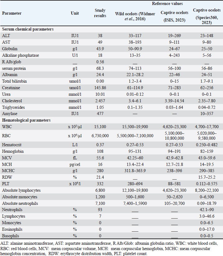 In the evaluation of the peripheral blood smear tinted with Wright’s stain, structures compatible with apicomplex protozoan hemoparasites were observed in the form of a ring inside the erythrocytes, which possibly correspond to Cytauxzoon spp., reported in wild felines in some studies (Davis, 1929; Ketz-Riley et al., 2003; Luaces et al., 2005; André et al., 2011; Alvarado-Rybak et al., 2016; Wang et al., 2017). In Brazil, there are reports of infection by Cytauxzoon spp. in ocelots (André et al., 2009, 2011). In the case of ocelots in Colombia, Cytauxzoon spp. has been identified in reports in the literature but without molecular confirmation (Ayala et al., 1973). Since smear tests are the only evidence, it is important to clarify that direct observations of blood smears do not allow species identification and molecular techniques are needed. Likewise, Wright’s stain is neither diagnostic nor indicated for the morphological identification of hemoparasites. Nematodes such as Ancylostoma, Ascaridea, and Toxocara cati are common in mammals that have been extensively studied. However, the report of Dicrocoelium spp. in humans and domesticated and wild carnivores is until now considered an atypical finding, making this report the first documented case of Dicrocoeliosis spp. in ocelots. These infections can occur due to the consumption of infected livers or coprophagy of ruminant feces, as reported in the literature (Burger et al., 2006; Mitchell et al., 2017; Moure et al., 2017). Capillaria spp. are widely distributed parasites and can be found in numerous domestic and wild carnivores (Bédard et al., 2002; Fiorello et al., 2006; Whitehead, 2009; Guimarães et al., 2020; Alam, 2023). However, this constitutes the first report of this parasite in the bladder of a wild ocelot, and this infection may contribute significantly to the kidney failure that is evident in the blood chemistry analysis carried out since, in other studies, this type of infection in other mammals has been reported related to mild renal failure (Bédard et al., 2002; Rossi et al., 2011). It is also important to mention that the habitat of the ocelot in this study has strong anthropogenic pressures, such as livestock and mining, which can also affect the health status of the animal. Although no association between the environment and the health of ocelots has been reported, the manifestation of chronic kidney failure has been documented in humans living in mining environments (Afrifa et al., 2017; Coulibaly et al., 2020). ConclusionLike other small feline species, the ocelot (Leopardus pardalis) has received little attention in health research, which is why these findings have important implications for the conservation of this species. The information obtained about its health expands knowledge about the clinical parameters of this species in wild conditions, information that enriches the literature and that, through future reviews, will contribute to the elaboration of guides for the clinical management of this species and the formulation of more effective conservation strategies. In addition to the findings and contributions of this study, which enrich the information on the parameters and analytes of blood chemistry and hematology, this study reports, for the first time, infections by Capillaria sp. and Dicrocoelium sp. for the species in the wild. This study highlights the need to continually monitor the health and genetics of ocelot populations to guarantee their long-term survival and thus favor protection strategies for this species and its habitat. Likewise, this report contributes to monitoring infectious diseases and their circulation among different species, including humans, as an expanded public health strategy under a One Health vision to prevent and manage emerging infectious diseases that invites reflecting on considering health states and the ecology of diseases. Interactions between species are a variable of interest and a determining factor in public health and conservation approaches. AcknowledgmentThe researchers express their gratitude to the Research Vice-Rectory of Corporación Universitaria Remington, the Deanship of the Veterinary Medicine Faculty, Panthera’s Small Cat Program, and the environmental team of Zijin-Continental Gold for their support during the project. Similarly, we acknowledge and appreciate the assistance of Maricruz Jaramillo, Victor Quiroz, Jacobo Chamorro, Valentina Martínez, María Clara Vasquez, and Juliana Jaramillo in the field during capture and monitoring. Many thanks to Laurel Seyries for sharing her knowledge and training the local team. We also extend our appreciation to Professor Clara Susana Arias for her initial efforts within the project from the Faculty of Veterinary Medicine of CUR. Conflict of interestThe authors declare that there is no conflict of interest. Authors’ contributionsM.F.S.: Research, processing of chemical and hematological samples, information analysis, writing, review; J.L.: Conceptualization, processing of chemical and hematological samples, data analysis, review, and editing; M.E.: Conceptualization, processing of chemical, hematological samples, and diagnosis of hemoparasites, data analysis, review, and editing; C.U.M.: Conceptualization, molecular studies, data analysis, review, and editing; HA.B.Ll.: Conceptualization, parasitological studies, data analysis, review, and editing; A.P.: Monitoring, capture, field studies, clinical analysis; D.S.: Conceptualization, review, editing, project administration; and J.F.Z.: Information analysis, writing, review, editing, project administration. FundingThis study was conducted within a solidarity project framework of Corporación Universitaria Remington [code no. 4000000368]. Data availabilityAll information and data related to this study is explicitly detailed in the manuscript. ReferencesAdrados, B., Zanin, M., Silveira, L., Villalva, P., Chávez, C., Keller, C., González-Borrajo, N., Ha