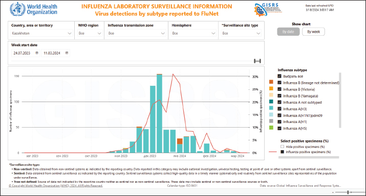 Fig. 2. Identification of influenza virus subtypes in Kazakhstan during the 2023–2024 epidemic season, FluNet data. To date, there is no data on the study of IV circulation among dogs in Kazakhstan, molecular or serological. This is the first study to identify IAV in dogs in Kazakhstan. The results of our studies indicate that out of 180 examined dog blood sera, seropositivity was revealed for both the H3 and A/H1N1pdm viruses with titers of 40–80. Only one serum (0.56%; 95% CI: 0.0–0.39) was positive for anti-A/H3N2 antibodies with a titer of 1:160. Our data correlate with the results of Jang et al. (2017), indicating higher seropositivity in a dog infected with the pandemic strain of IAV H1N1pdm09 with symptoms of respiratory infection than in healthy animals (Jang et al., 2017). From this, we can conclude that at the time of the study, the animal was probably infected with IAV H3. In our study, the percentage of dogs seropositive in the HI assay is higher than in the ELISA, so the likelihood of IAV-infected dogs may be significantly higher. This fact is confirmed by other studies (Damiani et al., 2012; Kwasnik et al., 2020; Jurado-Tarifa et al., 2020). Circulation in dogs of IAV H5, H7, H9, and type B was not detected either in RT-PCR or in serological studies. Finally, it should be noted that dogs, as companion animals, are in close contact with humans. In addition to the established CIV lineages H3N2 and H3N8, a large number of different IAVs have been identified in them: seasonal human H3N2 and pandemic H1N1, avian IAVs H5N6, H5N2, H3N1, H9N2, and H10N8 (Sun et al., 2013; Zhang et al., 2013; Lee et al., 2016; Wang et al., 2019; Wasik et al., 2021). There is information on the isolation of reassortant CIV A/H3N2 from dogs, in Korea (Song et al., 2012; Moon et al., 2015). Dogs inoculated with human IAV H3N2 are known to show no clinical signs of infection, but infection is confirmed by viruses shedding from the throat and seroconversion (Paniker and Nair, 1972). Serological studies in different countries have shown the presence of antibodies against human and avian IAVs such as H3N2, H1N1, H5N1, and H9N2 in dogs (Su et al., 2014; Wasik et al., 2021; Kovalenko et al., 2021; Jimenez-Bluhm et al., 2021). It is worth noting that receptors such as 2,3-SA, and 2,6-SA are observed in the respiratory tracts (goblet and subepithelial cell regions) and in the large intestine of dogs, which contribute to their susceptibility to animals and humans IAV (Ning et al., 2012). Considering that dogs are susceptible to various IAVs and are in close contact with humans, their potential as vessels for the formation of reassorted strains can be considered high (Abdelwhab and Mettenleiter, 2023). Undoubtedly, our data are not sufficient to obtain a complete picture of IAV circulation in the dog population in Kazakhstan. The relatively small sample size of individuals on the scale of Kazakhstan (only Almaty and the Almaty region were considered), and the limitations of the methods used do not allow us to draw definite conclusions about the genetic and phenotypic characteristics of the virus that contribute to interspecific transmission. Additional experiments are needed to understand the molecular biology of the different IAV subtypes circulating in the canine population. In addition, further experiments are required to identify mutations that can affect the transmission of new virus subtypes during human-animal interactions. However, the results obtained (real time RT-PCR and serological analysis) confirm that the dogs are infected with IAV. This is the first monitoring study in Kazakhstan, which needs to be continued in relation to obtaining a whole genome characterization of IAV in dogs. Such a research design will help provide the information necessary to understand the role of dogs in the natural chain of spread of IAV, predict the epidemiological and epizootological situation, and select the correct strategy and tactics for preventive and anti-epidemic measures. ConclusionDogs, which are susceptible to IAVs and in close contact with humans, can serve as a source of potentially dangerous reassortant strains of IV or subtypes with zoonotic potential. To date, there are no documented cases of human infection with any of the CIV subtypes. However, there are many described examples of infection in dogs with human IAV, including seasonal H1N1 and H1N1pdm09 IAVs, as well as seasonal H3N2 viruses (Murcia et al., 2010; Kim et al., 2013; Zhao et al., 2014; Klivleyeva, et al., 2022). Although these infections have not been observed to further spread among dogs, however, human IAV may reappear with CIV during natural coinfections in dogs (Jang et al., 2017; Chen et al., 2018, 2023). Under these conditions, due to ongoing genetic changes, new strains of the IVs may appear in dogs, which can become a source of infection for other animals and humans. This close contact between humans and dogs may pose a public health threat due to the potential for zoonotic transmission of IVs to humans (Abdelwhab and Mettenleiter, 2023). Unfortunately, very little is known about the genetic and phenotypic characteristics of the virus and host that contribute to interspecies transmission. There is also a lack of knowledge about the mechanisms by which these zoonotic viruses may subsequently adapt to efficiently replicate and spread among humans. Besides this, very few countries are dealing with this problem. Research in this area has shown that many countries in Asia and Africa have published few sequences and do not regularly sequence viruses as part of their monitoring programs (Escorcia et al, 2012). Genetic sequencing is known to identify changes that influence the phenotype of IV circulating, which in turn improves preparedness for epidemics and pandemics throughout the world (Escorcia et al, 2012). Preparations for the possible emergence of animal IV in humans include routine global surveillance of animal populations and