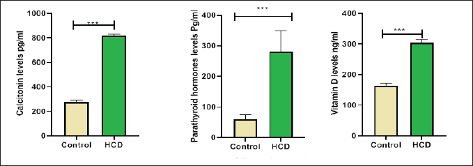 Fig. 3. PTH and calcitonine and vitamin D in male rats after hypercholesteremic diet, rats in control group were fed normal diets daily for eight weeks, while rats in hypercholesteremic-diet (0.2 mg/kg BW cholesterol) were fed normal diets daily for eight week. The endothelial cells that line blood arteries may suffer harm from high cholesterol levels and this results in an increase of oxidative stress by inflammation (Fernández-Sánchez et al., 2011). On the other hand, high cholesterol can affect how well mitochondria operate, and when they malfunction, the total amount of the ROS produced might go up which leads to a reduction in GSH levels and elevation in MDA levels (Xiao et al., 2022). The enzyme NADPH oxidase is linked to elevated cholesterol due to its generation of ROS (Masoud et al., 2014). The current investigation revealed no significant disparity in serum TRAP levels between the control group and the treated group, as depicted in Figure 2. This outcome may be attributed to rats having individual variability in their TRAP response to osteoporosis induction. Some rats may see a notable rise in serum TRAP levels, while others may not. This variance may be attributed to hereditary causes, hormone changes, or other underlying variables that impact bone metabolism (Garnero, 2008). This study was in disagreement with some of the studies that have shown that TRAP levels and activity are elevated in individuals with osteoporosis compared to healthy controls. This indicates increased osteoclast activity and bone resorption, which are characteristic features of osteoporosis. TRAP levels have been correlated with BMD and can be used as an indicator of bone turnover and disease severity (Chung et al., 2005). Also, results demonstrated that the hypercholesterolemic diet groups exhibited elevated ERK activity compared to the control groups (Fig. 3). The ERK signaling pathway has been extensively investigated in the context of osteoporosis, and its activation or inhibition can potentially impact bone health, activation of the ERK signaling pathway has been linked to enhanced osteoblast (cells responsible for bone formation) activity and increased bone formation and conversely, inhibiting the ERK signaling pathway may lead to reduced osteoblast activity and a consequent loss of bone mass (Matsushita et al., 2009). Hypercholesterolemia can lead to alterations in lipid raft composition affecting the localization and activation of signaling molecules including those involved in the ERK pathway. The arrangement of lipid rafts may enhance the clustering and activation of RTKs and downstream effectors, leading to sustained ERK activation (Degirmenci et al., 2020). Also, High cholesterol levels can induce oxidative stress which can activate ERK signaling pathways. Oxidative stress is known to activate various intracellular signaling cascades including ERK in a variety of cell types. Therefore, oxidative stress induced by a hypercholesterolemic diet may contribute to increased ERK activation in bone cells (Rezatabar et al., 2019). In the current study, there was a significant increase in the (PTH, vitamin D, and calcitonin) in the cholesterol group as compared with the control group as shown in Figure 3. Calcium-sensing receptors (CaSRs) play a crucial role in regulating PTH secretion by sensing changes in extracellular calcium levels and the intracellular. Oxidative stress has been associated with changes in the function of the CaSR (Mroczko et al., 2023). The CaSR is a G protein-coupled receptor that plays a crucial role in maintaining calcium homeostasis in the body by sensing changes in extracellular calcium levels. It is primarily expressed in parathyroid glands (Chavez-Abiega et al., 2020). Oxidative stress can impact the expression levels of the CaSR. Complex intracellular pathways regulate CaSR signaling, and oxidative stress syndrome may impair the receptor’s signal-transmitting capacity in response to changes in calcium levels (Kosiba et al., 2020). Prolonged exposure to oxidative stress may contribute to parathyroid hyperplasia, a condition characterized by the hyperactivity of the parathyroid glands, this actiate could be a compensatory response to oxidative damage, aiming to maintain adequate PTH production. However, the hypertrophic changes may lead to dysregulation of PTH secretion, leading to the connection between oxidative stress and the endocrine function of the parathyroid glands. This can interrupt these signaling cascades, which can lead to an imbalance in the level of the (PTH, vitamin D, and calcitonin) in the cholesterol grouping as compared with the control group (Hong et al., 2021). ConclusionIn conclusion, these results provide insights into the biochemical and hormonal alterations associated with cholesterol-related conditions; and concluded that increased oxidative stress, altered signaling, and disruptions in calcium/bone metabolism are associated with cholesterol-related conditions. AcknowledgmentThe authors would like to thank the University of Kerbala, College of Veterinary Medicine for facilitating this research. Conflict of interestThe authors declare that there is no conflict of interest. Authors’ contributionsDuaa Raad Abd Al Ameer was data collection and curation of study; Wefak Albazi was formal analysis and interpretation of results and Hayder ALi muhammed writing the original draft and paragraph and designing the statistical figures. FundingThis research received no external funding. Data availabilityAll data supporting the findings of this study are available within the manuscript and no additional data sources are required. ReferencesAl-Safo, A.A. and AlDulaimi, L.H. 2022. Effect of orlistat and aquatic extract of Rosmarinus officinalis leaves in histopathological changes in kidney of albino rat. Iraqi. J. Vet. Sci. 36(2), 393–400. AL-tememy, H.A.H. 2023. Effect of folic acid on avascular bone necrosis in mice associated with hypercholesterolemia. J