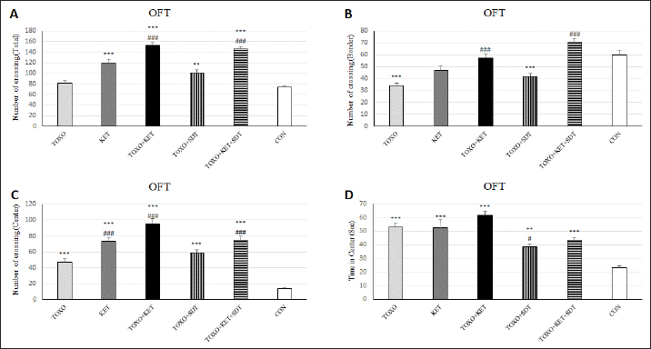 Fig. 1. Effects of experimental toxoplasmosis (TOXO), ketamine-induced schizophrenia (KET), simultaneous toxoplasmosis + Ketamine-induced schizophrenia (TOXO + KET). (TOXO+KET), and sulfadiazine-trimethoprim as the treatment for toxoplasmosis (TOXO+SDT) and toxoplasmosis + ketamine-induced schizophrenia (TOXO+SDT+KET) on the number of total squares crossed (A), border (B), center crossing (C), and time in the center (D) relative to control (CON) in the open field test (OFT). Values are presented as mean ± SEM for the number of 10 mice per group. *p < 0.05 versus CON, **p < 0.01 versus CON, ***p < 0.001 versus CON, #p < 0.05 versus TOXO, ###p < 0.05 versus TOXO (ANOVA followed by Student–Neuman–Keuls test).