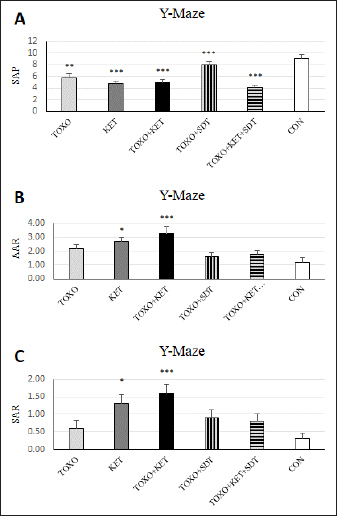 Fig. 4. Effects of experimental toxoplasmosis (TOXO), ketamine-induced schizophrenia (KET), simultaneous toxoplasmosis + Ketamine-induced schizophrenia (TOXO + KET), and sulfadiazine-trimethoprim as the treatment for toxoplasmosis (TOXO+SDT) and toxoplasmosis + ketamine-induced schizophrenia (TOXO+SDT+KET) on the number of spontaneous alteration performance (SAP) (A), alternate arm return (AAR) (B), and same arm return (SAR) (C) relative to the control (CON) in Y-maze. Values are presented as mean ± SEM for the number of 10 mice per group. *p < 0.05 versus CON, **p < 0.01 versus CON, ***p < 0.001 versus CON, #p < 0.05 versus TOXO, ###p < 0.001 versus TOXO (ANOVA followed by Student–Neuman–Keuls test). Our results from the Y-maze test underscore the disruption of short-term memory and cognitive performance, particularly in KET and TOXO+KET mice. This observation mirrors previous reports highlighting spatial and recognition memory deficits induced by NMDAR antagonists (Sun et al., 2021). T. gondii infection has been demonstrated to significantly downregulate genes linked to synaptic transmission and cognitive behavior in the prefrontal cortex of mice (Wu et al., 2023). While the cognitive impairment resulting from parasitic infection is well recognized in animals and humans, there currently exists no effective therapy for the cognitive deficits associated with T. gondii infection. However, in our study, treatment with sulfadiazine-trimethoprim showed some promise in ameliorating memory deficits in treated mice. The brain antioxidant defense mechanisms play a pivotal role in safeguarding against neuronal damage. The neurodegeneration induced by the protozoan parasite T. gondii has been attributed to oxidative damage in the brains of infected mice (Bottari et al., 2016). Ketamine administration in mice disrupted brain antioxidant status and triggered increased lipid peroxidation, a finding corroborated by our observations of decreased levels of CAT, SOD, and GPx, coupled with elevated (MDA levels in TOXO, KET, and especially TOXO+KET mice). This indicates that the compounded adverse effects of combined toxoplasmosis infection and ketamine administration exacerbate the negative impact on brain antioxidant status. While the dopamine theory of schizophrenia has long been a cornerstone in understanding its etiology, recent attention has shifted towards the significant role of NMDARs. In contrast to the dopaminergic model, the complex array of symptoms and neuropsychological dysfunctions in schizophrenia can be more cogently explained through a glutamate/NMDA framework (Kantrowitz & Javitt, 2010). Recent research has unveiled a connection between T. gondii and schizophrenia through cross-reactive mechanisms in the host’s immune responses, which impact NMDAR dysfunction. It’s been suggested that anti-T. gondii immune responses developed during active protozoan infection may cross-react with host NMDARs, ultimately disrupting neural circuits and leading to cognitive deficits (Lucchese, 2017). In our study, a downregulation of NMDAR-NR1 and NR2A was evident in mice subjected to schizophrenia and toxoplasmosis, except for TOXO+KET+SDT mice. This raises the possibility that NR1 and NR2A subunits might play a role in some of the neurological effects induced by T. gondii and ketamine. Nevertheless, despite significant behavioral alterations, no significant shift was noted in NR1 and NR2A expressions among TOXO+KET+SDT mice.