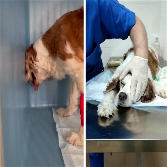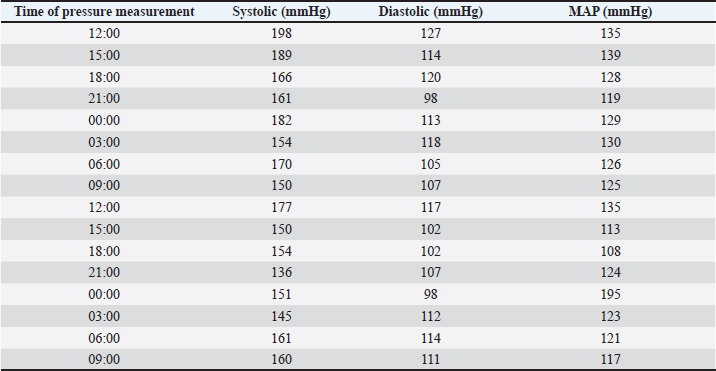 Fig. 1. Dog presented in head pressing and with altered mental status. Table 1. Blood pressure values during the three days of hospitalization from treatment starting.