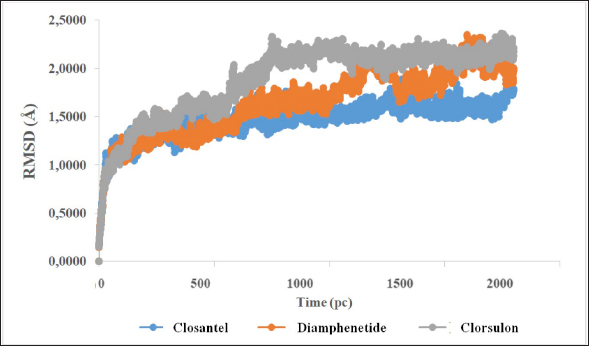 Fig. 5. RMSD of closantel ligand (blue) on FhCL-5, and clorsulon ligand (grey) and diamfenetide (light brown) on FhCL-2. DiscussionCathepsin-L also known as excretory-secretory products are released by parasites during host infiltration. These molecules are deduced to function as effector molecules efficient in modulating the host immune system, and enabling parasite survival. FhCL-2 and FhCL-5 are immunomodulatory molecules which advantageous to the flukes by manipulation of host immune processes, therefore prolonged parasitic infection (Ryan et al., 2020). In this study, the interaction of FhCL-2 and FhCL-5 ligands with anti-trematodes were discussed. Based on the thermodynamic equation, the lower ∆Gbinding value, the stronger the enzyme-ligand complex bond will be. This is due to the stability and strength of non-covalent interactions in the enzyme-ligand complex which are observed from the amount of free energy released when the interaction of the enzyme-ligand complex is formed. The docking simulation results in Table 4 showed that clorsulon and diamfenetide were two ligands that released the greatest energy when interacting with FhCL-2 enzyme. Clorsulon had the strongest affinity with a ∆Gbinding value of −15.21 kcal/mol, with an inhibition constant (pKi) value of 32.25 µM, significantly different (p < 0.05) from other ligands. The diamfenetide ligand had a ∆Gbinding value of −14.90 kcal/mol with an inhibition constant (pKi) of 31.54 µM. For FhCL-5, closantel showed a strong affinity with a ∆Gbinding value of −14.88 kcal/mol and an inhibition constant (pKi) value of 31.51 µM (p < 0.05), and diamfenetide had a ∆Gbinding value of −13.47 kcal/mol with an inhibition constant (pKi) of 28.58 µM (Fig. 3, Table 4). Evaluation of the visualization of ligand molecular complex on FhCL-2 and FhCL-5 showed the number of hydrogen bonds play a major role in increasing the affinity (Fig. 4). For FhCL-2, clorsulon ligand formed six hydrogen bonds with Lys 68(2), Tyr 69, Asp 110, Gly 112, and Asp 250. Meanwhile, the diamfenetide ligand only had one hydrogen bond with Asp 59. For FhCL-5, closantel ligand had three hydrogen bonds with amino acids Asp 21, Asn 14, and Thr 58, and diamfenetide ligand only had one hydrogen bond with Thr 58. The changes in hydrogen bonds had an impact on the deviation of molecular conformation which was observed in RMSD value. To ensure the dynamic stability of the ligand-enzyme complex, RMSD values of enzyme backbone atoms were calculated. An increased in RMSD value indicates that the enzyme structure is starting to open and the ligand is starting to find suitable binding sites or coordinates on the protein (Das et al., 2019). A stable RMSD value indicates the maximum conformation of the protein bond to the ligand and the ability to maintain its position. Interactions between residues in enzymes also impact protein structure stability (da Fonseca et al., 2024). In this study, two anti-trematode ligands, clorsulon and closantel were stable when interacting with FhCL-2 and FhCL-5 enzymes, during the simulation, indicated by the deviation in the poses of these ligands was not at ± 2 Å. In Figure 5, it was shown that the time required for these ligands to form a stable complex with FhCL-2 and FhCL-5 was relatively similar (± 100 pc). However, as the dynamics progressed, it was observed that FhCL-5 complex with closantel ligand showed the best stability with a relatively smaller RMSD value compared to other ligands, which was between 1–1.8 Å. All these results suggested that closantel and clorsulon have prospective as inhibitors of FhCL-2 and FhCL-5, therefore future studies are necessary which include in vitro and in vivo validation to confirm these findings. ConclusionAnti-trematode drugs that have been tested in this study had the ability to inhibit FhCL-2 and FhCL-5 enzymes, confirmed by the identification and evaluation of molecular interactions in silico using molecular docking and molecular dynamics methods. Molecular docking analysis showed that clorsulon ligand had the strongest affinity for FhCL-2 macromolecule, while the best affinity for FhCL-5 was closantel ligand. Both ligands demonstrated strong stability in molecular dynamics simulations, as evidenced by their low RMSD values. Consequently, closantel and clorsulon emerge as promising candidates for inhibiting FhCL-2 and FhCL-5, in addition to their previously established pharmacological effects. It has, therefore, become a powerful alternative strategy to discover and develop novel drugs from existing drugs by using a molecular docking approach. AcknowledgmentThe authors would like to express gratitude to Faculty of Veterinary Medicine, Universitas Syiah Kuala for supporting this research, and to Research Laboratory members who providing technical assistance in conducting this research. Conflict of interestAll authors declare that there is no conflict of interest. FundingThis work was supported by Universitas Syiah Kuala with grant number 60/UN11.2.1/PT.01.03/PNBP/2023. Authors’ contributionAll authors contributed to this study, and all authors read and approved the final manuscript. Data availabilityAll data are provided in the manuscript. ReferencesBarbour, T., Cwiklinski, K., Lalor, R., Dalton, J.P. and De Marco Verissimo, C. 2021. The zoonotic helminth parasite Fasciola hepatica: virulence-associated cathepsin B and cathepsin L cysteine peptidases secreted by infective newly excysted juveniles (NEJ). Animals 11, 3495. Bhagat, R.T., Butle, S.R., Khobragade, D.S., Wankhede, S.B., Prasad, C.C., Mahure, D.S. and Armarkar, A.V. 2021. Molecular docking in drug discovery. J. Pharm. Res. Int. 33, 46–58. Collins, J.B., Stone, S.A., Koury, E.J., Paredes, A.G., Shao, F., Lovato, C., Chen, M., Shi, R., Li, A.Y., Candal, I. and Al Moutaa, K. 2024. Quantitative tests of albendazole resistance in Caenorhabditis elegans beta-tubulin mutants. Int. J. Parasitol. Drugs Drug Resist. 25, 100556. 