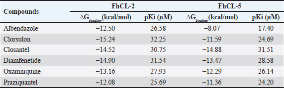 Table 4. ∆Gbinding value and inhibitor constant (pKi) of anti-trematode ligands.