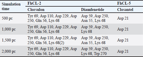 ResultsThe results of FhCL-2 modeling in the form of Ramachandran and RMSD plot analysis revealed that the best percentage residue of the protein model in the most favored region was 81.91%, in the allowed region was 14.24%, and in the disallowed region was 3.85%. RMSD value for 2OX6 was 0.593 Å. For FhCL-5, the best percentage residue of the protein model in the most favored region was 82.57%, in the allowed region was 11.97%, in the disallowed region was 5.46%, and the RMSD value was 0.566 Å (Table 2, Fig. 1). Docking was carried out using the “blind docking” method with the “site binding” target as seen in Table 3. The docking process produced two important things, i.e. orientation and position of a ligand as an inhibitor of an enzyme and predicting the affinity of a ligand for an enzyme/receptor as a docking simulation target. Both of these were in the form of a scoring function (London dG) which is estimated as the binding free energy value (∆Gbinding) in kcal/mol. The ∆Gbinding value describes the strength of the bond occurred between the enzyme and ligand. There is a relationship between ∆Gbinding value and inhibitor constant (Ki), which follows the thermodynamic equation (Fig. 2) (Bhagat et al., 2021). The results of pKi of each tested ligands and molecular docking results are provided in Table 4 and Figure 3. Visualization of 2D and 3D interactions of ligands with the best affinity on FhCL-2 (clorsulon and diamfenetide) and FhCL-5 (closantel and diamfenetide) is presented in Figure 4. A lower ∆Gbinding energy indicates a stronger interaction, suggesting that clorsulon is a potent inhibitor of FhCL-2, and closantel is a promising inhibitor of FhCL-5. The interactions of ligands in the docking results showed that the enzyme was in a rigid state, therefore it had to be evaluated in a hydrated molecular state using the molecular dynamics simulation method. Molecular dynamics simulations showed that changes in hydrogen bond residue contacts between FhCL-2 and FhCL-5 enzyme-ligands occurred during simulation. Table 5 showed ligand interaction data during molecular dynamics simulation. The hydrogen bond interaction between ligand and amino acid which was the “binding site” of the enzyme during dynamic simulation did not experience any significant differences. The hydrogen bond of FhCL-2 to clorsulon had some differences when the simulation was run at 1,500 pc count, when the formation of two hydrogen bonds with amino acid Lys 68 was present. The hydrogen bond of FhCL-2 to diamfenetide was different when the simulation was run at 1,000 pc count, there was a loss of one hydrogen bonds on amino acid Asn 55. However, one hydrogen bond was formed on amino acid Trp 270 when the simulation was run at 2,000 pc. In FhCL-5 enzyme, interaction stability with closantel ligand was seen through one hydrogen bond with amino acid Asp 21 during dynamics simulation (Fig. 5).