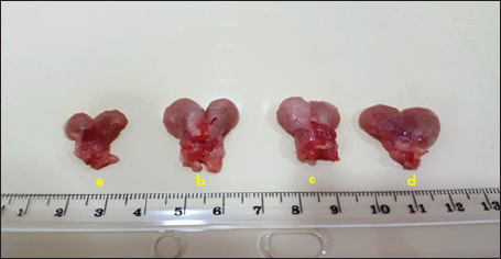 Fig. 1. Prostate gland size in (a) control group, (b) positive control, (c) finasteride group, and (d) flaxseed extract group.