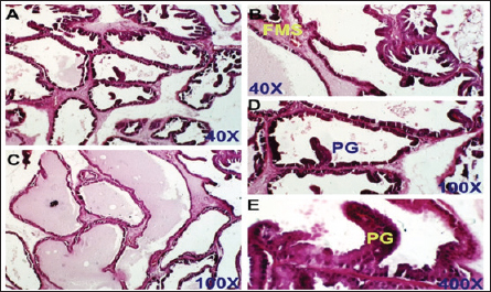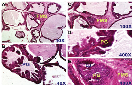 Fig. 4. Finasteride-treated group. section of the prostate gland shows almost normal prostatic epithelial layer, normal INT thickening, normal prostate fluid, and LU, but some fibro-mascularstroma (FMS), and few proliferated glands (PGs). H&E stain, (A) and (B) 40X. (C) and (D) 100X. (E) 400X.