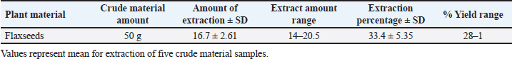 Serum analysisAt the time of sacrifice, entire blood samples were obtained by performing a cardiac puncture directly from the heart. Blood was placed into vacutainers without anticoagulants and left to clot for 30 minutes. Centrifugation at 1,500 g for 10 min was used to separate the serum. Assay of prostate-specific antigen (PSA), DHT, and 5-α-reductase enzymeThe enzyme immunoassay technique was used for the quantitative determination of PSA by using PSAspecific antigen ELISA kit (Ela Science Company Ltd., USA), Dihydrotestosterone (DHT) level by using rat DHT ELISA kit (Sunlong Biotech Company Ltd., China). 5-α-reductase enzyme by using rat steroid 5 alpha-reductase 2 (SRD5a2) ELISA kit (Sunlong Biotech Company Ltd., China). All ELISA procedures were performed according to the manufacturer’s protocols. Statistical analysisAll data were presented as means ± standard deviation (SD) values for six independent experiments. One-way ANOVA and the multiple comparison LSD test were used with SPSS (SPSS Inc., Chicago, IL) version 23 for Windows to determine the statistical significance between the groups. Differences were deemed significant when p<0.05 was reached. Ethical approvalThe Ethics Committee of the Thi-Qar Health Directorate, Al Habbobi Teaching Hospital has approved all treatments and experimental protocols. ResultsPlant extraction yieldThe yield percentage of flax seeds hydro-ethanolic extract of five crude material samples was 33.4% ± 5.35% at % a yield range of 28–41 for each 50 g of crude plant powder as shown in Table 1. Total body weight and prostate weightsThe total body weight changes of the rats in the control and the experimental groups are illustrated in Table 2. The final body weight decreases p < 0.05 significantly in the positive control group compared with other experimental groups. Other groups recorded no significant p > 0.05 differences in body weight among them. The whole prostate weight of the different studied groups is also illustrated in Table 2. Prostate weight of the PBH group (Positive groups) was significantly <0.05 increased (968.8 ± 39.2 g) compared to that of the normal group. At the same time, the prostate gland size in flax seed extract group and finasteride treatment group were significantly p<0.05 decreased than that of the BPH induction rats (Fig. 1). Prostate index significantly p < 0.05 increased in the BPH group (3.52 ± 0.11) when compared with negative control group (1.87 ± 0.06), whereas prostate index recorded (2.68 ± 0.09), (2.60 ± 0.08) in both flax seed extract and finasteride group, respectively. The percentage of prostate growth inhibition recorded 50.9, and 55.75 in both flax seed extract and finasteride treatment group, respectively, as shown in Table 2. PSA levelTable 3 shows the serum level of the PSA in the treated and control groups. There was marked significant p < 0.05 elevation in the serum PSA in the BPH induction rats 5.62 ± 0.28 ng/ml compared with negative control rats 2.89 ± 0.21 ng/ml. At the same time, finasteride and flax seed administrated rats exhibited a significant p < 0.05 reduction in PSA serum levels 3.93 ± 0.71 and 4.09 ± 0.26 ng/ml, respectively, as compared with the BPH induction group. However, the finasteride activity showed improved PSA better than flax seed extract activity. Table 1. Extraction ratio of flaxseeds extract.