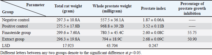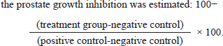 Table 2. Effect of flaxseed ethanolic extract, finasteride on total body weight, prostate weight, prostate index, and percentage of prostate growth inhibition