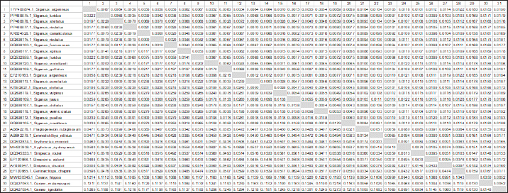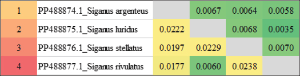 Table 2. Pairwise distances using 16S rRNA gene among four species of the family Siganidae, and the outgroup.