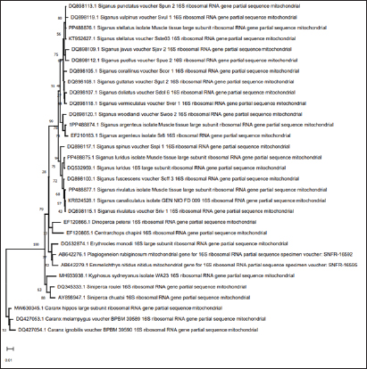 Open Vet. J.. 2024; 14(8): 1936-1941 Open Veterinary Journal, (2024), Vol. 14(8): 1936–1941 Research Article Mitochondrial 16S rRNA gene as a molecular marker in the phylogenetic relationships of some Rabbitfishes species (Siganidae: Perciformes)Najiah M. Alyamani*Department of Biology, College of Science, University of Jeddah, Jeddah, Saudi Arabia *Corresponding Author: Najiah M. Alyamani. Department of Biology, College of Science, University of Jeddah, Jeddah, Saudi Arabia. Email: nmalyamani [at] uj.edu.sa Submitted: 13/05/2024 Accepted: 06/07/2024 Published: 31/08/2024 © 2024 Open Veterinary Journal