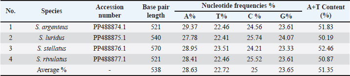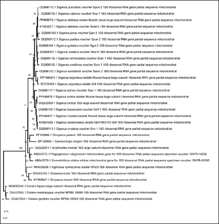 ABSTRACTBackground: Siganidae is a marine teleost family consisting of a single extant genus, Siganus Forsskål, 1775, which included 29 recognized species of rabbitfish. Aim: The main goal of this study was the use of the mitochondrial 16S rRNA gene as a potential molecular marker in the phylogenetic relationships study of some rabbitfishes species (Siganidae: Perciformes). Methods: The samples were gathered from the Red Sea. The sequences of four rabbitfishes (Siganus argenteus, Siganus luridus, Siganus rivulatus, and Siganus stellatus) were deposited into NCBI to gain the accession numbers (PP488874–PP488877) and then analyzed with their related rabbitfishes depending on available sequence data of the mitochondrial 16S rRNA gene. Results: The results of 16S rRNA sequences illustrated that the average A+T values were greater than C+G. Conclusion: The low genetic distance between S. luridus and Siganus rivulatus indicated a close linkage between them. Keywords: Mitochondrial 16S rRNA gene, Molecular marker, Rabbitfishes. IntroductionWith 27 species, siganids, or “rabbit fishes,” are a small family of marine herbivorous fish known as is widely spread throughout the tropical waters of the Indian Ocean, Red Sea, and Indo-Pacific (Woodland, 1983; Saoud et al., 2008). Moreover, subtropical Mediterranean locations have been reported to harbor these fish (Saoud et al., 2008; Insacco and Zava, 2016). A large range of salinity and temperature were tolerable to siganidas (Woodland, 1983; Saoud et al., 2007). In terms of growth, siganida grows similarly to other marine organisms that are cultivated. Its maximum weight and length are 318.2 g and 32 cm, respectively (Bariche, 2005). It is challenging to accurately identify fish and infer the evolutionary relationships among species based on their morphology in many taxonomic groups that are distributed around the world. This is because species that are descended from convergent evolution share comparable morphological traits, and the pattern of speciation is highly complex (Rice and Westneat, 2005; Duftner et al., 2007). Nowadays, it is thought that molecular marker-derived genetic information is crucial for the sustainable management, exploitation, and conservation of fisheries and animals as well as for promoting sustainable aquaculture (Casey et al., 2016; Lind et al., 2016). Species characterization using morphology and anatomical characters causes sometimes errors in the proper identification of closely related species. Because of these issues, molecular markers have been used as a complementary tool for taxonomic identification (AL-Qurashi and Saad, 2022). To comprehend biodiversity assessments, conservation management, evolutionary patterns, and processes, accurate species delimitation, and phylogenetic reconstruction are essential (Traldi et al., 2020; McCord et al., 2021). Fish species identification, fish resource management, and seafood monitoring are all performed achievable by mitochondrial DNA (Teletchea, 2009; Rubinoff et al., 2006). The mitochondrial 16S rRNA gene was used for molecular phylogenetic research in several fish species (Li et al., 2013). Because these genes are preserved and non-coding, they were crucial in establishing phylogenetic relationships (Rathipriya et al., 2022). The basic goal of this work was to evaluate the phylogenetic linkages of some species of rabbitfishes belonging to the family Siganidae by the mean of large mitochondrial rRNA (16S rRNA) gene. Materials And MethodsSamples collection and species identificationThe study sampling site was the Red Sea, where four species of family Siganidae (Siganus argenteus, Siganus luridus, Siganus stellatus, and Siganus rivulatus) were compiled and identified. In order to isolate DNA, the sample muscles were taken out and preserved at –20°C DNA isolation, and PCR amplificationUsing the DNA Mini kit (Qiagen, Germany) according to the manufacturer’s instructions, the genomic DNA was extracted from the conserved muscles. Using previously published primers, PCR was utilized to amplify a partial sequence of the mitochondrial 16S rRNA (Simon et al., 1991). Using 23 μL of 2X master mix, 1 μL of genomic DNA, 1 μL of each primer, and 20 μL of nuclease-free water, the PCR was finished in 46 μL. The amplification conditions included five minutes of denaturation at 95°C, thirty cycles of denaturation, annealing, and extension at 94°C, 48°C, and 72°C, respectively, for sixty seconds, and a final extension at 72°C for seven minutes. On a 1.5% agarose gel containing ethidium bromide and a 100 bp DNA ladder, the PCR results were electrophoresed. Sequences and phylogenetic analysisThe final sequences were finished by Macrogen (South Korea, Seoul). In order to obtain accession numbers, the 16S rRNA sequences were deposited into GenBank/NCBI. The sequences were aligned using CLUSTAL W (Thompson et al., 1994), using the default parameters. Using MEGA software version 7.0 (Kumar et al., 2016), two approaches were used for phylogenetic reconstructions: neighbor joining and minimum evolution. We employed 1,000 bootstrap iterations of Kimura two-parameter distances (Kimura, 1980) to finalize the sequence divergences (Felsenstein, 1985). ResultsThis work establishes the evolutionary lineages of four species of the family Siganidae: S. argenteus, S. luridus, S. stellatus, and S. rivulatus. This was achieved by employing large subunit ribosomal RNA (16S rRNA) sequences. In all four species, the 16S rRNA-produced bands range in length from 521 to 570 bp. The 16S rRNA sequences were shown in GenBank/NCBI to obtain the accession numbers (PP488874––PP488877). The findings show that S. argenteus and S. rivulatus possess the shortest sequence (521 bp.) while S. stellatus possesses the sequence with the greatest length (570 bp.). Adenine (A), thymine (T), cytosine (C), and guanine (G) exhibited average frequencies of 28,63, 22.72, 25, and 23.65%, respectively. As was shown in T