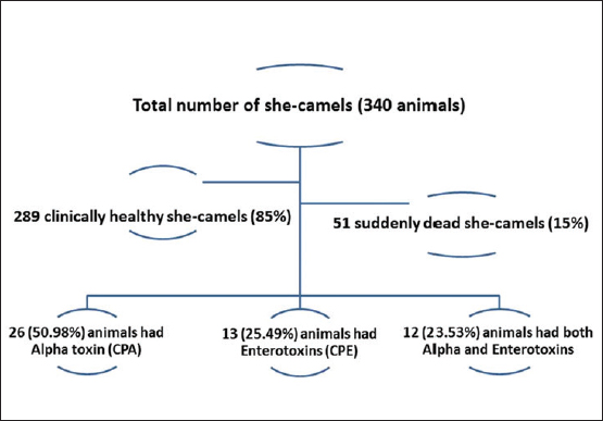 Fig. 1. Flow chart showing the numbers of total examined she-camels, suddenly dead she-camels, and types of C. perfringens toxins detected in the dead animals. Table 1. Descriptive demographic data and laboratory findings of the examined she-camels.