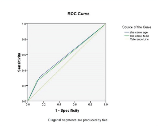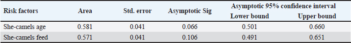 The antigens included endoparasites and bacterial infections, such as enterotoxins from Pasteurella multocida and C. perfringens. These enterotoxins significantly impact she-camels by lowering all vital processes, including milk production, fertility, calving rates, and working efficiency. In addition, the most noteworthy impact is the sudden death of camels (Al-Megrin et al., 2015). Table 4. The area under the curve of risk factors.