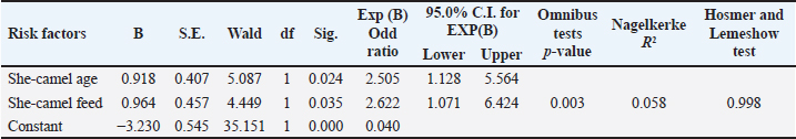 The live body weight of the examined camels ranged between 250 kg and 400 kg. These animals were fed on 3–4.5 kg concentrated ratios 13.5% or 18%/head/day and roughage feed ad libitum 1%–2% of live body weight. Out of 340 she-camels, 259 (76.17%) consumed a concentrated ration of 18%. Tables (3, 4, and 5) and Figure 2 demonstrated a significant association between sudden death, she-camels age, and feeding habits as risk factors (p=0.020 and 0.028, respectively). Risk factor assessment by RR revealed that the odds of RR of sudden death occurring among she-camels aged over 2 years were higher than those less than 2 years (2.24 CI 95%, 1.093–4.591). Furthermore, the odds RR of sudden death occurring due to exposure of she-camels to a concentrated ratio of 18% were higher twice than those not exposed (2.346 CI 95%, 1.039–5.296). As regards sudden death attributed to both risk factors, AR was 10.91% and 10.37%, respectively. When the ration was changed from a concentrated ration of 18% to a regular ration of 13.5% in only ten she-camels, the risk of sudden death decreased by 134.6 times. On the other hand, despite the RR reduction decreasing by 124 times when treating 10 camels, the camel age was a non-modified risk factor. Additionally, the camel’s age and feeding habits had ROC area under curve values above 0.5, indicating a significant association with C. perfringens infection. Table 5 predicted the risk factors using binary logistic regression. Both risk factors are twice as risky for she-camel age cases as the control group, with a she-camel age odds ratio of 2.505% 95.0% CI (1.128–5.564). Moreover, with a she-camel feeding odds ratio of 2.622 (1.071–6.424), both risk factors were significant (p=0.024 and 0.035, respectively). Still, the feeding was riskier with modified risk factors than camel age with non-modified risk factors. Overall, the model included both significant risk factors: the omnibus tests were significant (p=0.003), Nagelkerke R2 was preferred to the model, accounting for almost 5.8% of the variance of sudden death cases, and the Hosmer and Lemeshow test assessed whether the predicted probabilities matched the observed probabilities, so p=0.998, there was no difference between observed probabilities and predicted probabilities. That means a set of risk factors, both she-camel age and she-camels feeding, is needed to predict the actual sudden death probabilities that occur accurately. Finally, the probability of sudden death due to the she-camel feed was higher than the she-camel age (9.39% and 9.01%, respectively). DiscussionIn Saudi Arabia, the prevalence of harsh desert regions necessitates that one-humped camels (Camelus dromedaries) endure extreme environmental conditions like privation of water and scarcity of food, which explains the difference in the anatomical characteristics of camels from other animals to face ecological conditions that are not suitable for healthy living for different animals (Moselhy et al., 2023). This study detected sudden death due to enterotoxemia among Arabian camels (Camelus dromedaries) and associated risk factors which included the she-camel age and feeding.