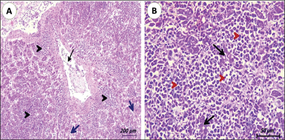 Fig. 2. Photomicrograph of liver from pigeons (3 years old) naturally infected with lymphoid leukosis. A) Liver showing multifocal aggregation of lymphoid cells (black arrowhead) around central veins (black arrow). Hepatocytes suffer from degeneration and pressure atrophy (blue arrow). (H&E, scale bar: 200 µm). B) Liver diffusely infiltrated by lymphoid cells, showing atypism and mitotic figures (red arrowhead). Islets of hepatocytes suffered from degeneration and atrophy (black arrow) (H&E, scale bar: 50 µm).