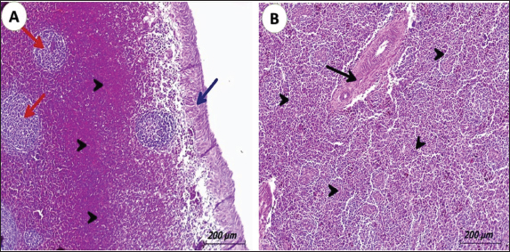 Fig. 3. Photomicrograph of spleen from pigeons (3 years old) naturally infected with lymphoid leukosis. A) Spleen showing hyalinized capsule (blue arrow). Severely hemorrhagic red pulp (black arrowhead) and depletion of white pulp (red arrow) (H&E, scale bar: 200 µm). B) Spleen displaying severe infiltrating of white pulp and red pulp with lymphoid cells (black arrowhead) and hyalinized splenic arterioles. (black arrow) (H&E, scale bar: 200 µm). OvaryThe ovarian stroma showing a mild infiltration with lymphoblast cells together with congestion of the vasculature was seen in some cases (Figs. 4D). The infiltrated tumor cells cause either necrosis or replacement of the ovarian stroma in other cases. In some birds, the infiltrating cells were in the interfollicular spaces and around ovarian follicles causing atrophied or undeveloped ovarian follicles (Figs. 4C). Examination of the ovary stained by IHC, the brown particles indicating the positive reaction for the presence of specific viral elements were detected in lymphocytes aggregated around ovarian follicle (Figs. 5D).