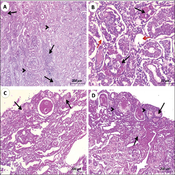 Fig. 4. Photomicrograph of kidney and ovary from pigeons (3 years old) naturally infected with lymphoid leukosis. A) kidney showing inter-tubular multifocal aggregation of lymphoid cells (black arrows). Many convoluted tubules suffer from degeneration and pressure atrophy (black arrowheads). (H&E, scale bar: 200 µm). B) Kidney revealing severe degeneration of convoluted tubules (red arrows). The glomerulus shows hyalinization (black arrows). (H&E, scale bar: 50 µm). C) Ovary display degeneration of ovarian stroma with atrophied ovarian follicles (black arrow) (H&E, scale bar: 200 µm). D) Ovary detecting mild lymphocytic infiltration around ovarian follicles (black arrowheads) and atrophied ovarian follicles. (black arrow). DiscussionThis study was carried out to illuminate the different pathological and immunohistochemical insights in pigeons due to ALV-A infection. Lymphoid leukosis is a neoplastic disease of chickens, turkeys, quails, pigeons, and pheasants (Payne and Venugopal, 2000; Payne and Nair, 2012) caused by subgroup A. The ALVs belong to the family Retroviridae. ALVs have been sub-classified into six subgroups, nominated A-E and J, which are created on their host variety and cross-neutralization forms (Zhang et al., 2010). In pigeons, the disease is rare and caused by subgroup A. It was revealed that pigeon cells were resilient to avian tumor viruses excluding ALV-D (Meyers et al., 1978). Since ALV-A was first isolated in the past century it has spread quickly all over the world causing economic losses in layer and breeder farms because the infected chickens usually exhibit tumors development (Miheso et al., 2017), depressed immunity, growth retardation, decrease egg production, and increased morbidity and mortality (Swayne et al., 2020). However, ALVs transmit to other several nations including Egypt. In Egypt, ALVs are transmitted to different types of chickens as native breeds and foreign breeds of layer chickens (Fotouh et al., 2024b). In addition to a higher number of culls, nonlaying birds and mortality in pigeons that accredited to either the direct outcome of the virus; in which death occurred due to tumor initiation by the virus (Průková et al., 2007), or due to the indirect effect of the virus through immunosuppression of the infected pigeons (Wang et al., 2012; Swayne et al., 2020). so, mixed bacterial infection especially E. Coli species (Abu El Hammed et al., 2022) and Salmonella species (Soufy et al., 2016) may occur; causing increased mortalities, a drop in egg production, and economic losses associated with reduced efficiency. Concerning post-mortem inspections, the liver, spleen, and kidneys were the most affected organs. The liver appeared uniformly enlarged occupying most of the abdominal cavity with diffuse tumor foci, which give a mottled or granular appearance in some cases. Other livers were mostly friable and the cut surface in tumor foci appears grayish to creamy white and may have areas of necrosis. The spleen and kidneys were diffusely hemorrhagic and enlarged. These findings were completely agreed with Zhang et al. (2019) and Rahman et al. (2020).