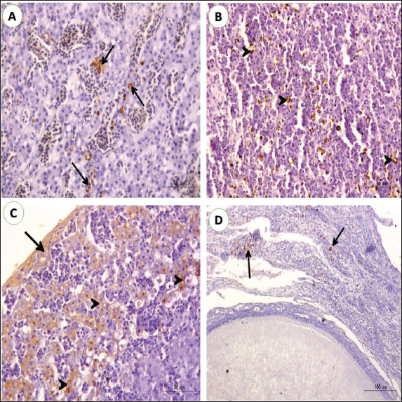 Fig. 5. Photomicrograph of liver, spleen, kidney, and ovary from pigeons (3 years old) naturally infected with lymphoid leukosis. A) Liver; the brown particles indicated the positive reaction for the presence of specific viral particles in lymphocytes aggregated in hepatic parenchyma (black arrows) (IHC stain, scale bar: 50 µm). B) Spleen; the brown particles indicated the positive response for the presence of exact viral elements in lymphocytes distributed in white and red pulps (black arrowheads). (IHC stain, scale bar: 50 µm). C) Kidney; high immunoreactivity in lining epithelium of convoluted tubules (black arrowheads) and lymphocytic infiltration under capsule (black arrows) (IHC stain, scale bar: 50 µm). D) Ovary; The brown particles indicated the positive response for the presence of definite viral particles in lymphocytes aggregated in ovarian stroma. (black arrows) (IHC stain, scale bar: 100 µm). Microscopic assessment of the liver determined the incidence of lymphoid leukosis. The liver lesions were accumulations of lymphoblastic cells. Sagarika et al. (2017) recorded the same findings in chickens. The antigen staining by IHC indicated the positive reaction for the presence of specific viral elements in the Kupffer cells and lymphocytes this provisions the preceding results in chickens which were established by noticing the virus from liver tissues using PCR. Those outcomes were consistent with Fotouh et al. (2020, 2024b), Sagarika et al. (2017), and Gharaibeh et al. (2001). The microscopic examination of the spleen sections revealed a lymphoid population in red and white pulps. The high affinity to splenic tissue may be attributed to species differences and tropism. Viral antigen was extreme in the lymphoid follicles of the spleen by IHC. These consequences were reinforced by Wang et al. (2013) and Fotouh et al. (2024b) who verified ALV-J-positive signals in the erythroblast cytoplasm, spleen, lung, and additional tissues particularly rich in blood. The microscopic evaluation of the kidney exposed multifocal aggregations of lymphoid cells. The tumor cells were infiltrated between the deteriorated renal tubules and round dilated blood vessels. The renal tubules showed pressure atrophy and hyaline casts or sloughing of epithelial lining in some renal tubules together with pyknosis of the nucleus. Some previous reports by Bande et al. (2016) and Chesters et al. (2002) designated those microscopic alterations, such as lymphoma caused by ALV-A chiefly arising in the livers, kidneys, and, spleens; in particular, several typical microscopic lesions might be seen in the liver (Payne, 1992; Begum et al., 2016). We concluded that ALV-A detected more in the liver and spleen and caused severe alterations. In some other cases, characteristic tumors produced by ALV-A arise in the livers and spleens of birds (Xu et al., 2016). This reflection may be correlated to the gathering of a large quantity of ALV-A in these organs. Ovaries mostly were undeveloped. Microscopically, mild infiltrates of neoplastic lymphoid cells were seen. These results agreed with Fenton et al. (2005). Viral antigens were detected around ovarian follicles and in interfollicular spaces, the same finding was reported by Fotouh et al. (2020) and Haridy et al. (2019) in chickens. This directly influences the production performance of pigeons and facilitates the vertical transmission of the virus, which is considered a new challenge that needs further studies. ConclusionThe current study was the first report in Egypt concerning the infection of pigeons by lymphoid leukosis. The finding confirmed the typical gross signs and the pathological picture of lymphoid leukosis which were characterized by enlarged organs having military nodules occupying most of the abdominal cavity also the ALV-A antigen detected in different organs. Further examination is required to determine the extent of the disease to other species as well as further inspection of pigeon flocks to demonstrate other leukosis subgroups. AcknowledgmentsThe authors are grateful to all colleagues from the Faculty of Veterinary Medicine, New Valley University, who made this study possible. Author’s contributionsAbdelmenem Ahmed Elmeligy: Supervision, and Visualization. Ali A. Ghania: Investigation, Methodology, Supervision, Writing—review and editing. Ahmed Fotouh: Methodology, Conceptualization, and Validation. All authors read and approved the final manuscript. Conflict of interestThe authors claim no conflicts of interest in publishing this research. FundingNone. Data availabilityAll data supporting the findings of this study are available within the manuscript. ReferencesAbo-Aziza, F.A.M., Zaki, A.A., Adel, R.M. and Fotouh, A. 2022. Amelioration of aflatoxin acute hepatitis rat model by bone marrow mesenchymal stem cells and their hepatogenic differentiation. Vet. World 15(5), 1347–1364. Abu El Hammed, W., Soufy, H., EL-Shemy, A., Fotouh, A., Nasr, M.N. and Dessouky, M.I. 2022. Prophylactic effect of oregano in chickens experimentally infected with avian pathogenic Escherichia coli O27 with special reference to hematology, serum biochemistry, and histopathology of vital organs. Egypt. J. Chem. 65(6), 269–282. Bande, F., Arshad, S.S. and Omar, A.R. 2016. Isolation and metagenomic identification of avian leukosis virus associated with mortality in broiler chicken. Adv. Virol. 2016, 9058403. Begum, M.D., Rahman, M.M., Akter, M.R., Haque, M.A., Rahman, M.K., Hossain, M.M. and Amin, M.N. 2016. Identification of avian leukosis virus from layer chicken by serological test and embryo inoculation technique. Asian-Aust. J. Biosci. Biotechnol. 1, 23–30. Chesters, P.M., Howes, K., Petherbridge, L., Evans, S., Payne, L.N. and Venugopal, K. 2002. The viral envelope is a major determinant for the induction of lymphoid and myeloid tumors by avian leukosis virus subgroups A and J, respectively. J. Gen. Virol. 83, 2553–2561. Elbarbary, N.K., Abdelmotilib, N.M., Goma