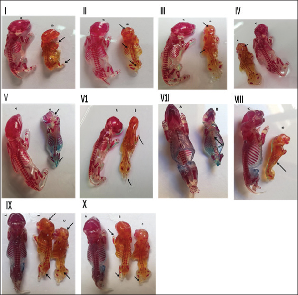 Fig. 1. Skeletal malformation induced by oral administration of silver nanoparticles. (I): Feti from dam mice received 50 mg/kg BW AgNPs from 6th to 15th day of pregnancy (B) showed absence of carpal, tarsal, and phalanges of fore limb and hind limb and in complete ossification of metacarpal and metatarsal (arrow) (A) control. (II): Feti from dam mice received 50 mg/kg BW AgNPs from 6th to 15th of pregnancy (B) showed incomplete ossification of skull bones (inter parietal, parietal, occipital, and frontal) also in complete ossification of ribs and caudal vertebrae (arrow) control (A). (III): Feti from dam mice received 100 mg/kg BW AgNPs from 6th to 15th day of pregnancy (B) showed incomplete ossification of skull bones (inter parietal and parietal) and ribs (arrow) compared with control (A). (IV): Feti from dam mice received 100 mg/kg BW AgNPs from 6th to 15th day of pregnancy (B) showed incomplete ossification of occipital bone of the skull (arrow) compared with control (A). (V): Feti from dam rat received 100 mg/kg BW AgNPs from 6th to 15th day of pregnancy (B) compared with control (A) showed complete absence of skull bones (inter parietal and parietal) and incomplete ossification of caudal vertebrae (arrow). (VI): Feti from dam rats received 1/50 LD5 100 mg/kg BW AgNPs from 6th to 15th day of pregnancy (B) showed absence of carpal, tarsal, and phalanges of fore limb and hind limb and incomplete ossification of metacarpal and metatarsal (arrow) compared with control (A). (VII): Feti from dam rats received 100 mg/kg BW AgNPs from 6th to 15th day of pregnancy (B) showed absence of xiphosternbrae and incomplete ossification of sternbrae (arrow) compared with control (A). (VIII): Feti from dam rats received 100 mg/kg BW AgNPs from 6th to 15th day of pregnancy (B) showed incomplete ossification of ribs (arrow) compared with control (A). (IX): Feti from dam RATS received 50 mg/kg BW AgNPs (B) and feti from dam rats received 100 mg/kg BW AgNPs (C) from 6th to 15th of pregnancy showed incomplete ossification of skull bones and caudal vertebrates (arrow) compared with control (A). (X): Feti from dam RATS received 50 mg/kg BW AgNPs (B) and feti from dam rats received 100 mg/kg BW AgNPs (C) from 6th to 15th of pregnancy showed incomplete ossification of fore and hind limb bones (arrow) compared with control (A). Table 2. Pectoral and pelvic girdle malformation of feti from dams received different doses of silver nanoparticles from 6th to 15th day of pregnancy.
